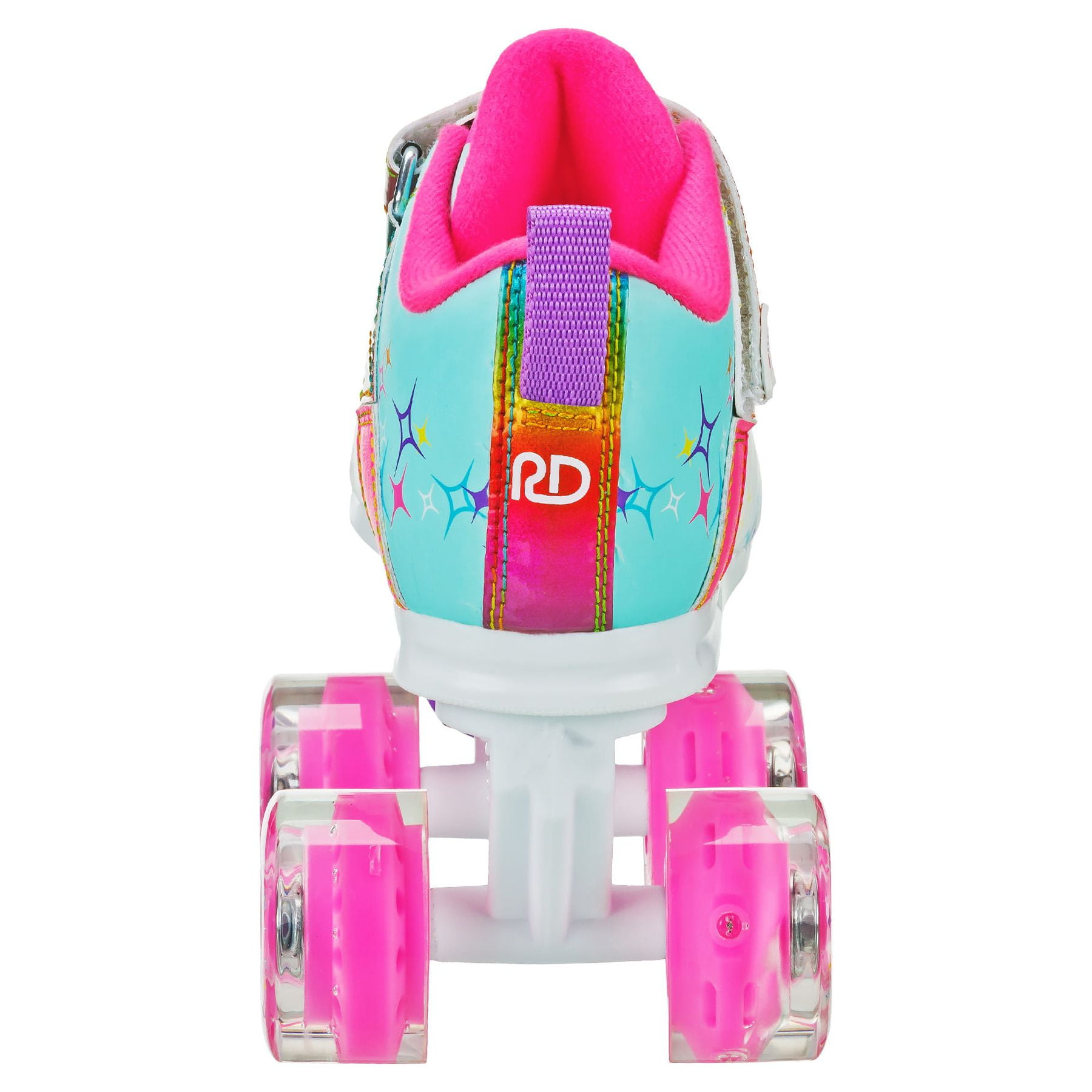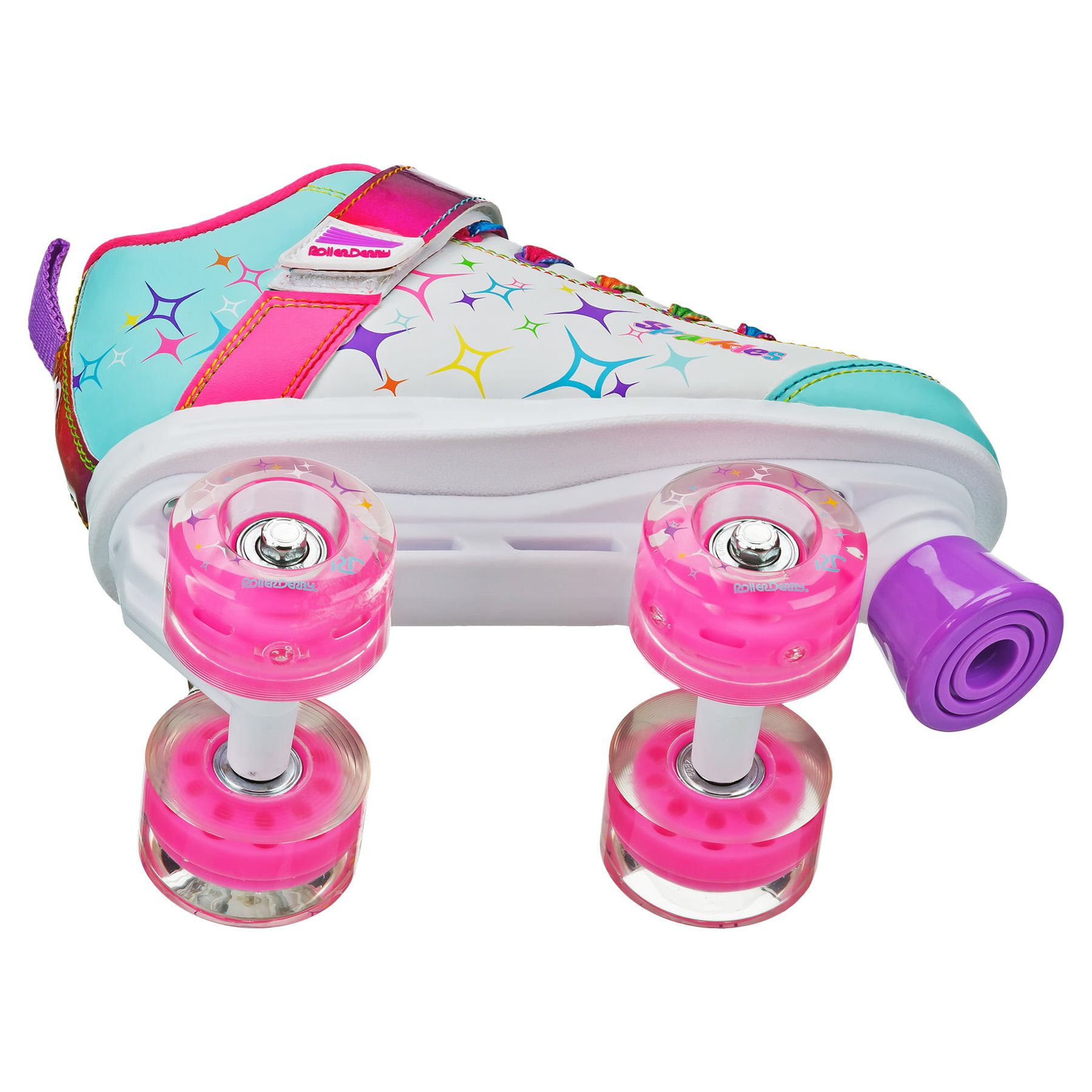 Illuminate the rink with the Roller Derby Sparkles and Blazer quad roller skates, designed to make every skating session a fun and exciting experience. These eye-catching skates are not only stylish but also boast vibrant LED wheels that light up with every movement, ensuring you stand out on the floor. Each skate features two wheels that light up when the wheel rolls, using the power generated by movement – no batteries are required! These urethane wheels are not only eye-catching but they have the right grip and bounce for rink or sidewalk. Crafted for comfort and performance, the skates feature a durable composite frame and a comfortable padded boot, providing stability and support for hours of skating fun. Perfect for beginners and seasoned skaters alike, these skates come in various sizes to suit all ages. Spark up your skating adventures with Roller Derby’s Light Up Roller Skates! Your child is sure to have fun! These skates fit true to U.S. children’s shoe sizes. Roller Derby® is America’s Skate Company since 1936.