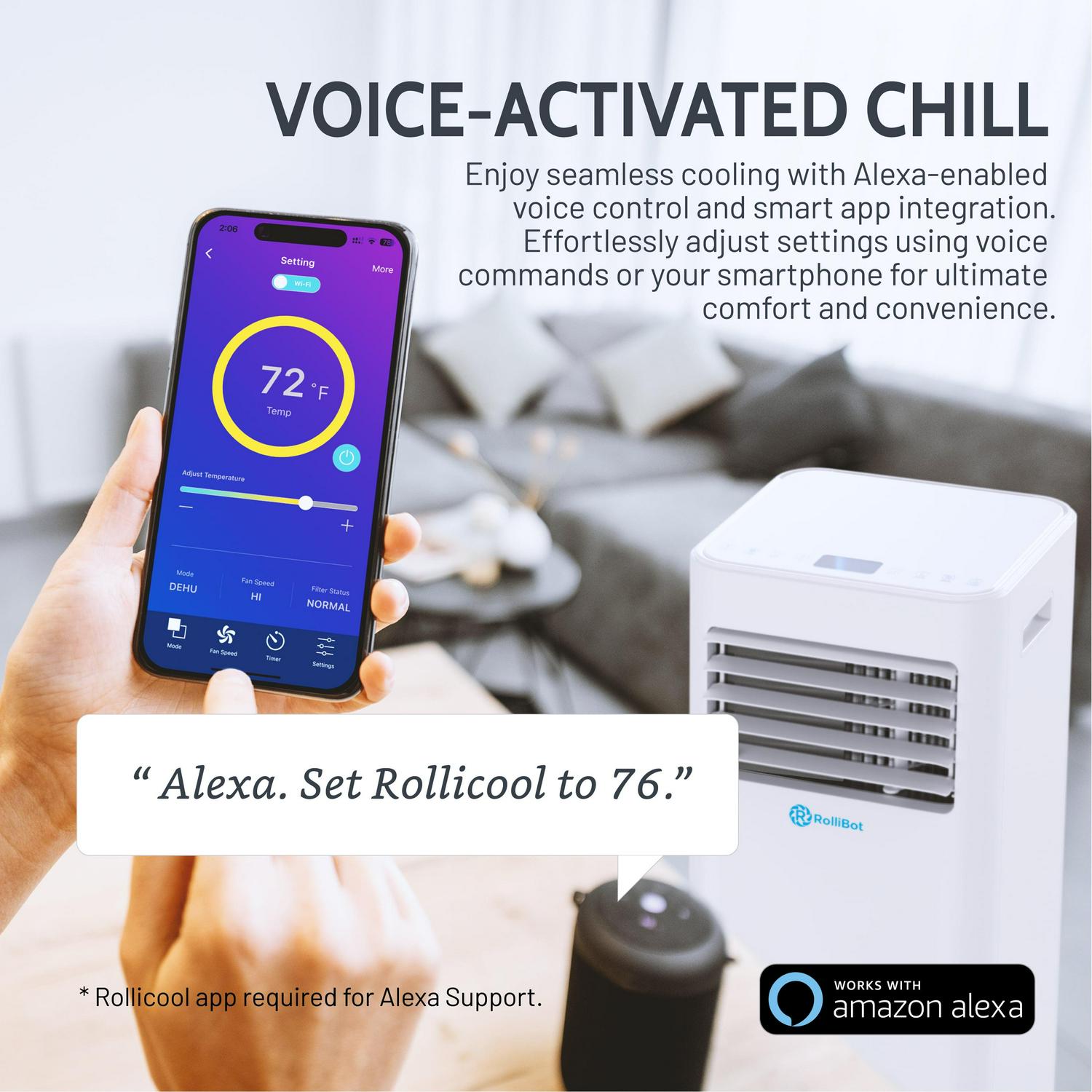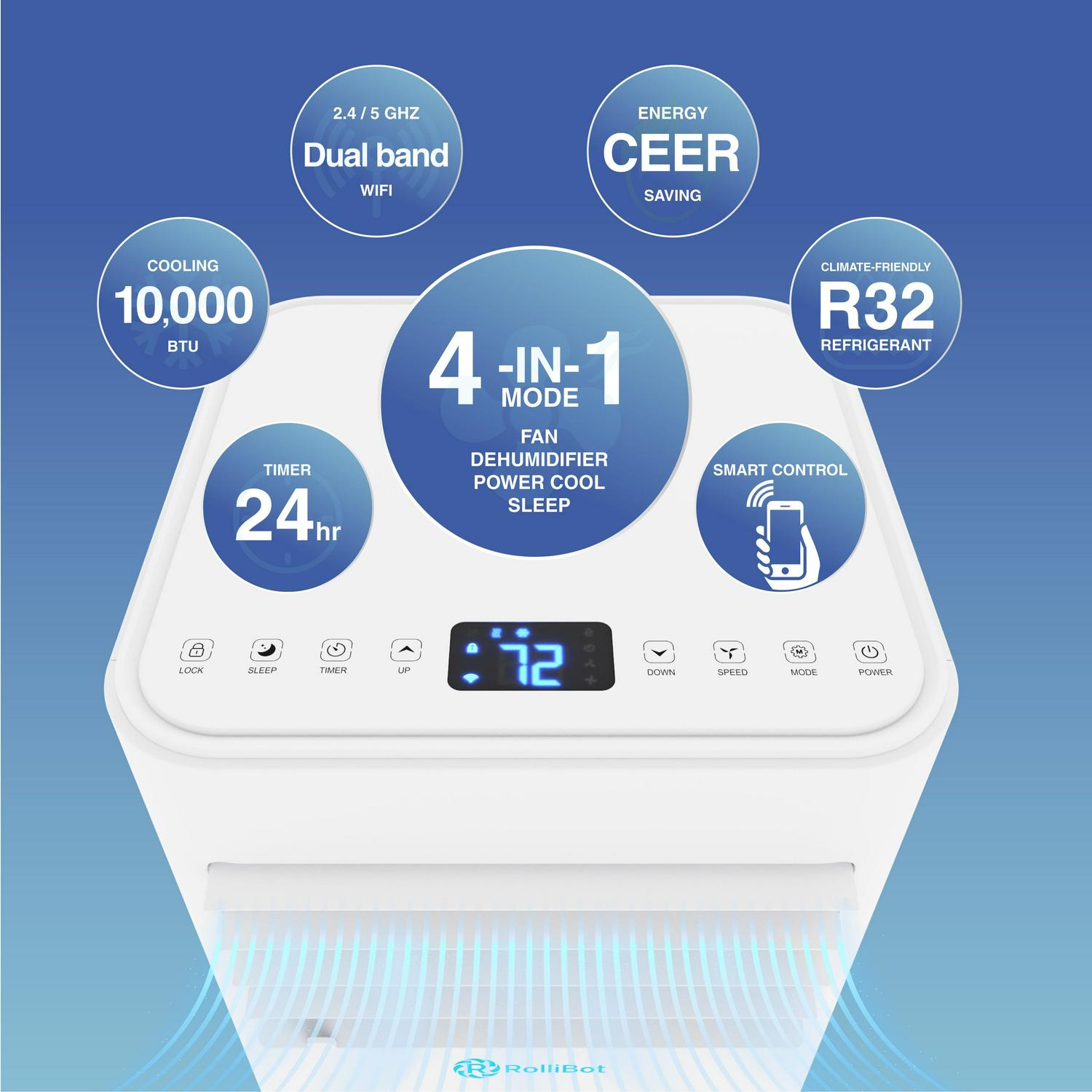 ROLLICOOL Alexa-Enabled Portable Air Conditioner for Rooms up to 450 sq ft – 10,000 BTU 4-in-1 Smart AC Unit with Dual-Band Wi-Fi and App, Dehumidifier, Fan, 24-Hour Timer w/ Sleep