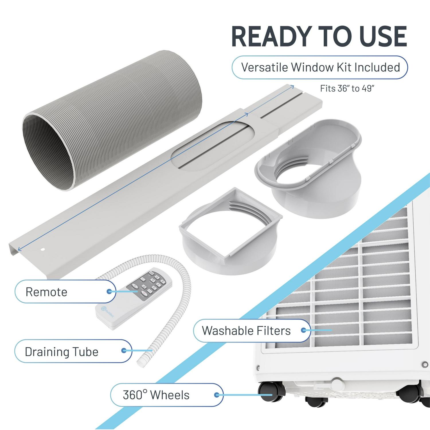 – PORTABLE COMFORT – Easily move the ROLLICOOL personal air conditioner between rooms. No heavy lifting is needed, thanks to the easy-grip handles and 360° caster wheels. And the included venting kit installs in minutes on all standard windows.