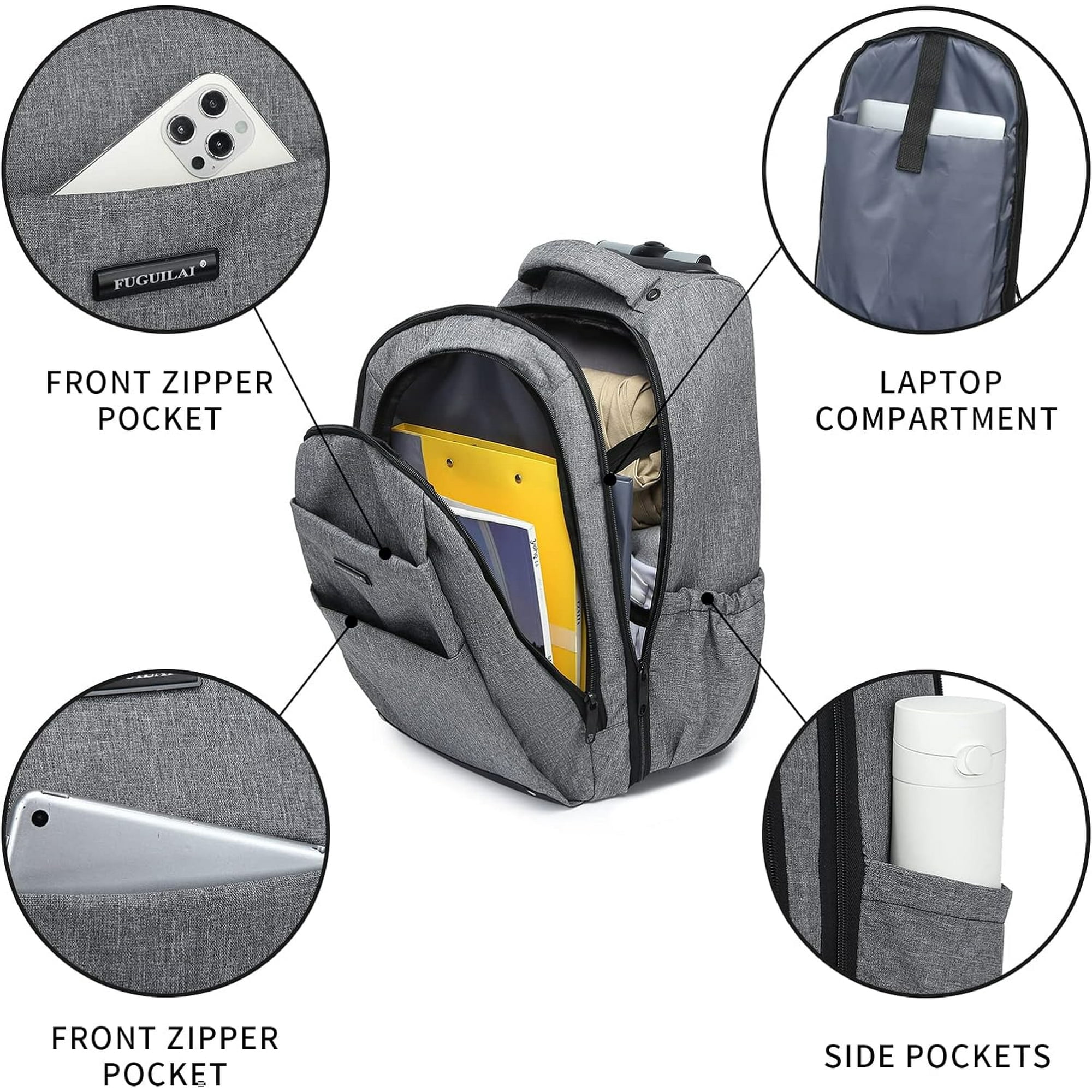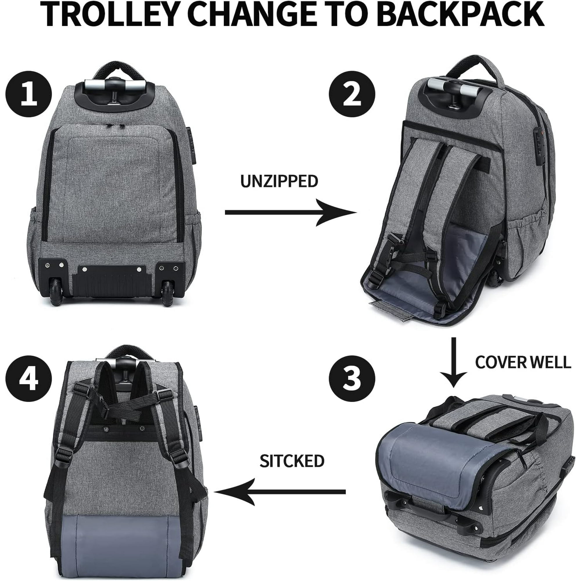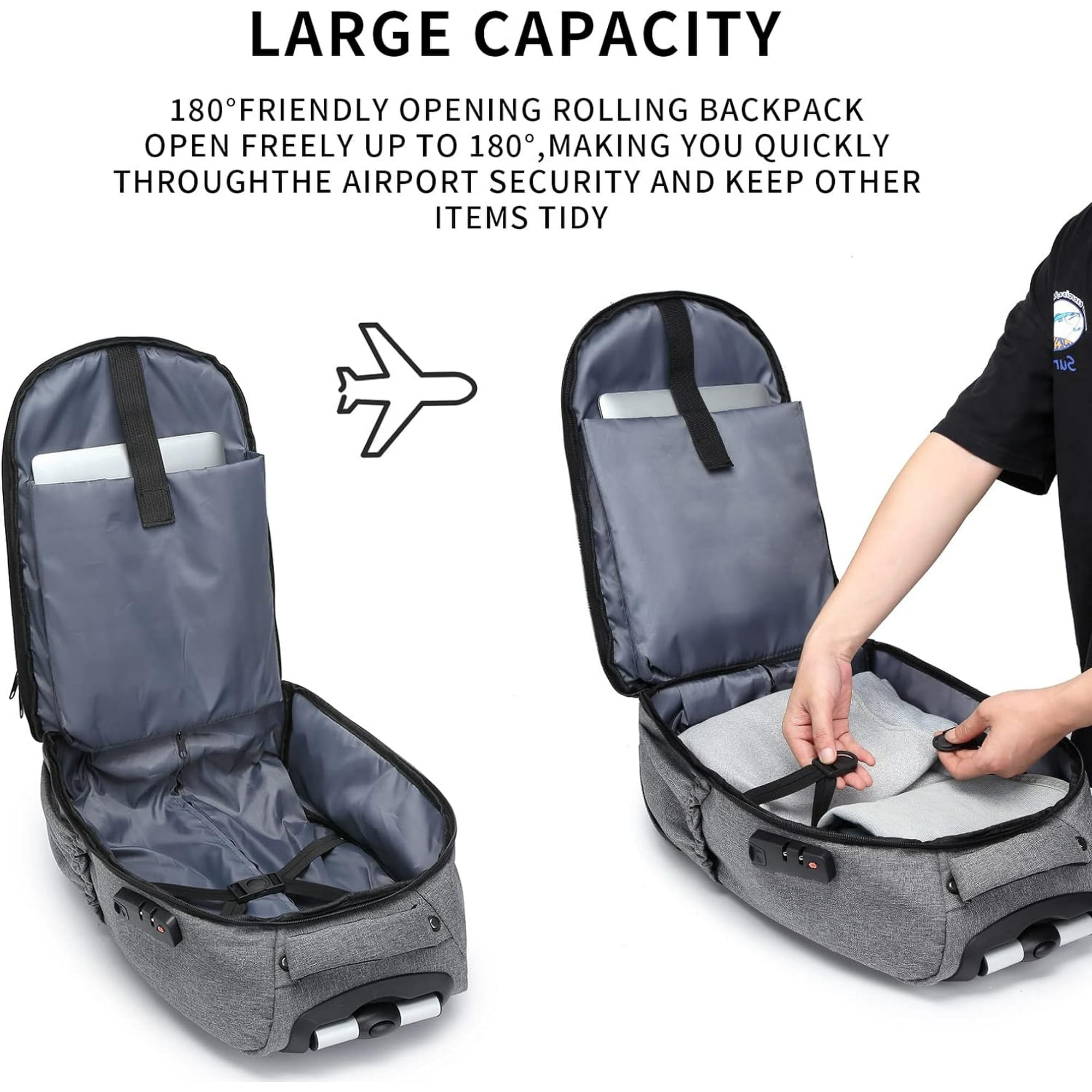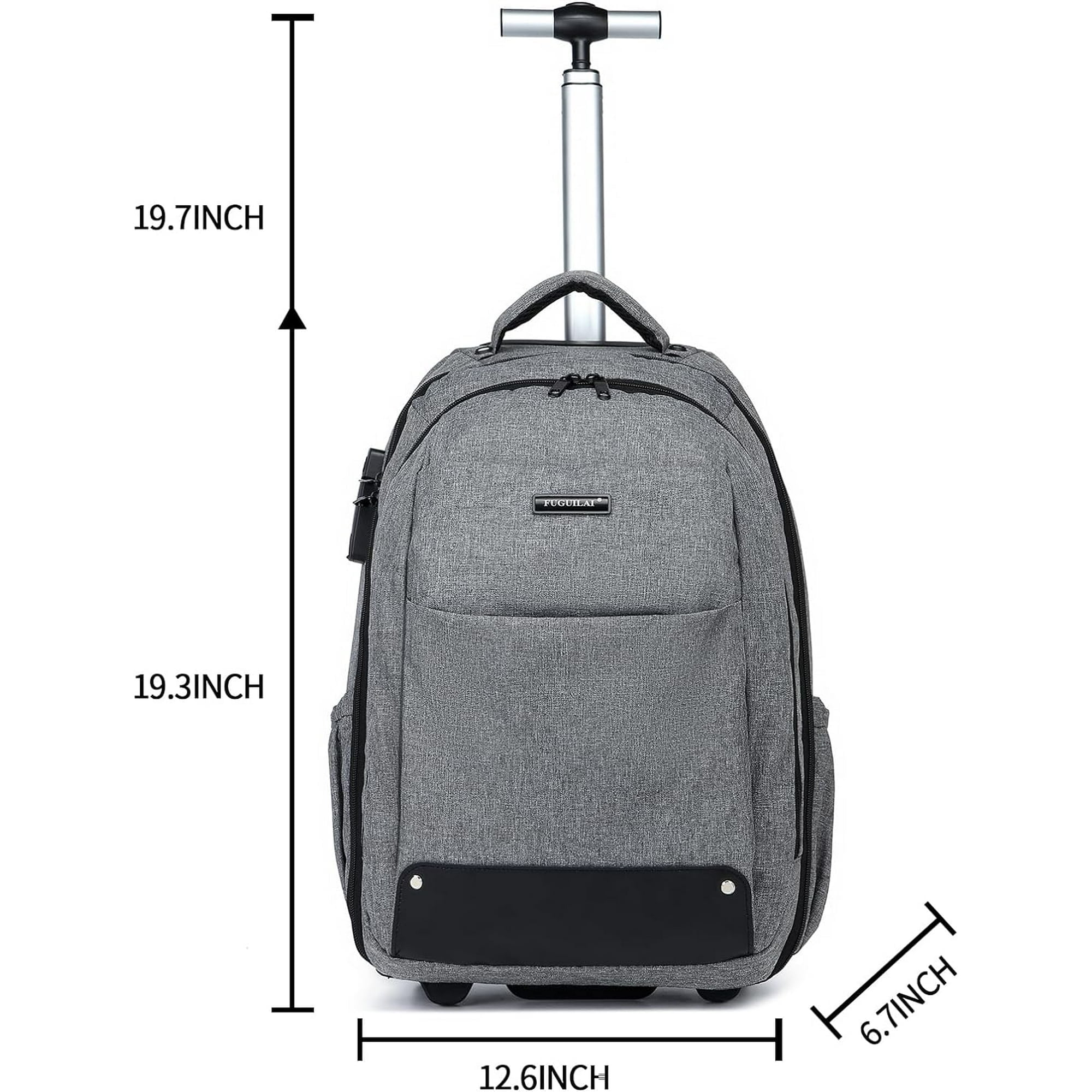 LARGE CAPACITY AND MULTI-CAPACITY COMPARTMENTS: to save time, the Travel Rolling Backpack is individually designed with a quick-access large 35L compartment – which can hold 2-3 days of personal travel essentials, and a soft padded computer sleeve that can hold up to a 17-inch laptop and keep it safe. There are also two front pockets and a compartmentalized pocket in the secondary pocket for cell phones, rechargeable household items, and more, with a side pocket for drinks. Backpack and rolling backpack switch at will: are you still worried that a heavy backpack will damage your back? The rolling backpack with wheels frees up your shoulders for smooth movement of free weight rolling in any occasion. The wheeled backpack is used as a regular travel backpack by pulling open the shoulder strap organizer pockets, and the flap is secured to hide the wheels, so wheel dirt won’t get on your clothes. 2-in-1 backpack for easier and healthier living! MAKES YOUR TRAVEL EASIER: The Adult Rolling Backpack makes traveling with a full load a breeze. Designed with two reliable in-line rubber wheels and a durable adjustable handle, you can smoothly traverse anywhere without bending over and it’s sturdier than other telescoping handles on the market. This high-capacity rolling backpack comes with a laptop compartment and is perfect for traveling. DURABLE AND WATERPROOF MATERIAL: The travel backpack is made of durable oxford fabric with a special waterproof coating that helps keep your gear dry. Newly upgraded rolling laptop bag main compartment on both sides with added lining prevents items from falling out when the zipper is pulled to the lowest end. Reinforced edges and steel frame provide excellent tear strength in a lightweight material. BEST CHOICE FOR BUSINESS AND LIFE: Multi-functional rolling backpack is fully prepared for international business travelers and life. Travel rolling backpack is perfect gift for women, men, large backpack for traveling, business fashion laptop backpack. Rolling laptop backpack fits under airline seats or stored overhead!