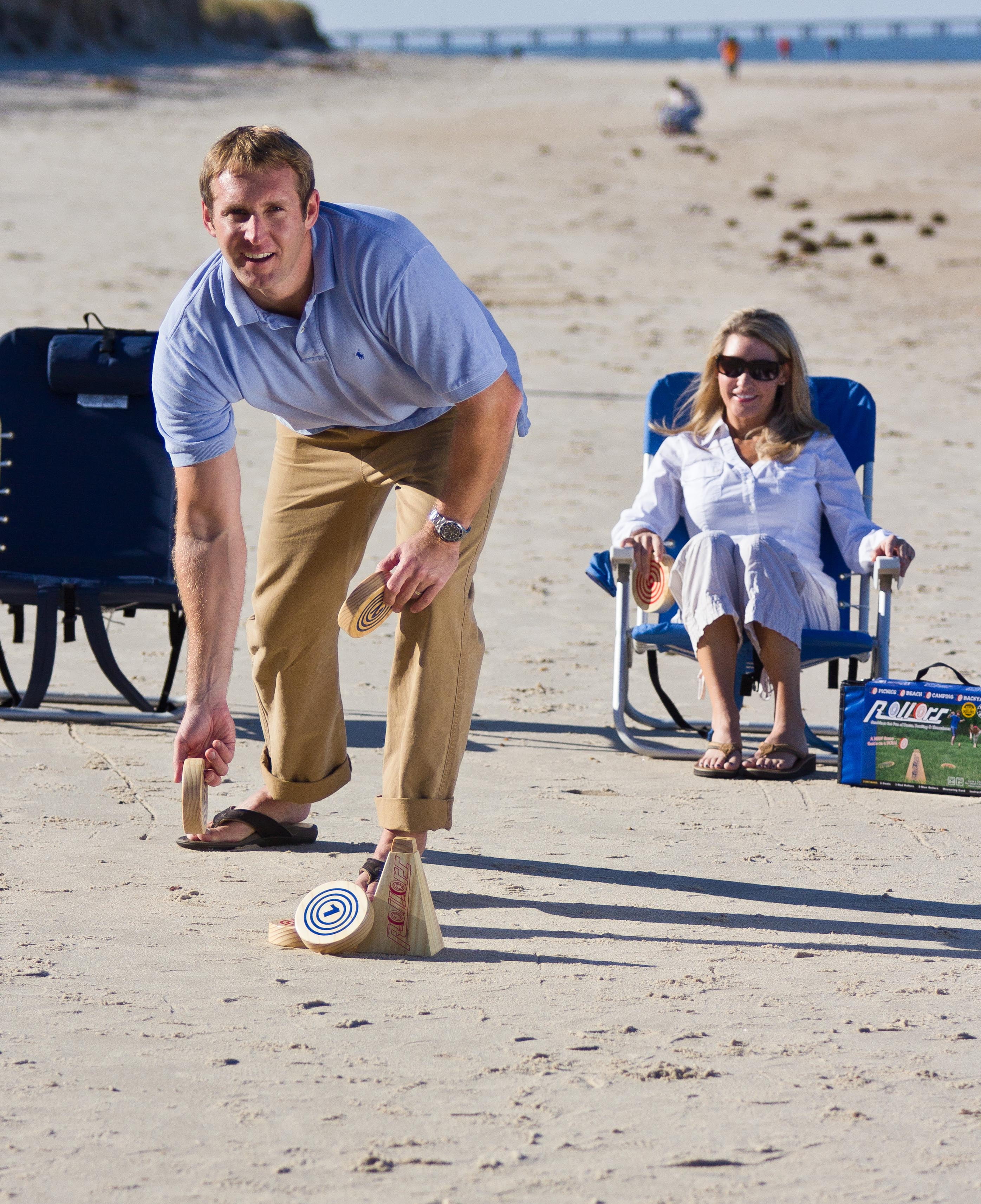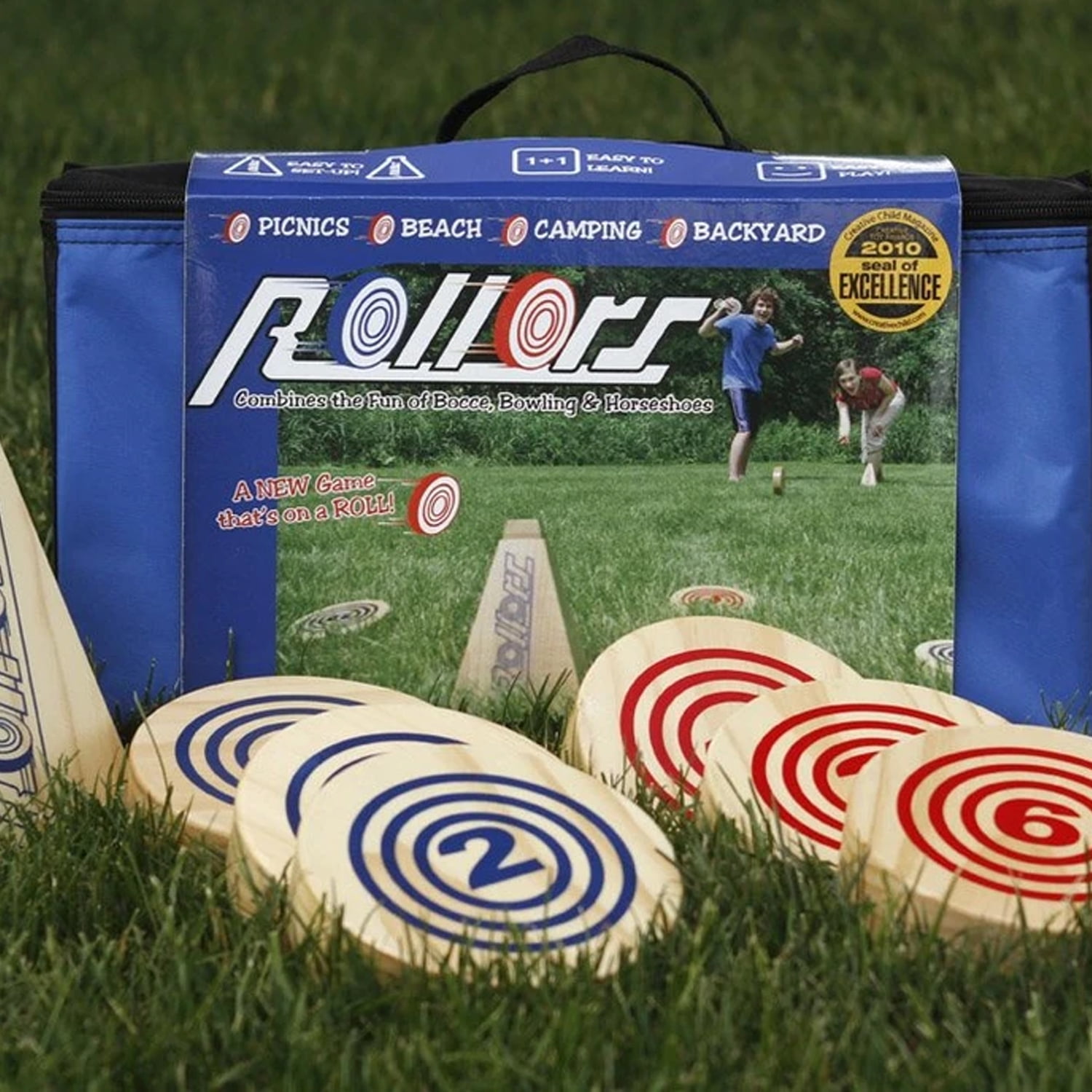 Get ready for the brand new backyard lawn game that combines all your favorite games for endless hours of fun! Rollors is a new outdoor yard game which feels familiar, as it combines some traditional games into one package. With Rollors it will feel like playing horseshoes, bocce ball and bowling at the same time, but with a twist! Combining both skill and luck, Rollors will keep everyone engaged and it is the family game you’ve been looking for! This backyard bowling game includes 6 wooden discs (3 blue and 3 red) and 2 pyramid targets. Take turns rolling the discs toward the targets and see who can get the closest and earn the highest score. A measuring device is included for those photo-finish rounds. Divide your party up into teams of 3 or go head-to-head against another person. Instructions are included to get you started. The wooden lawn game set comes with a durable nylon carrying bag that keeps everything safe and secure in your garage or trunk. Make any camping trip, birthday party, or wedding reception more memorable with this exciting new game.