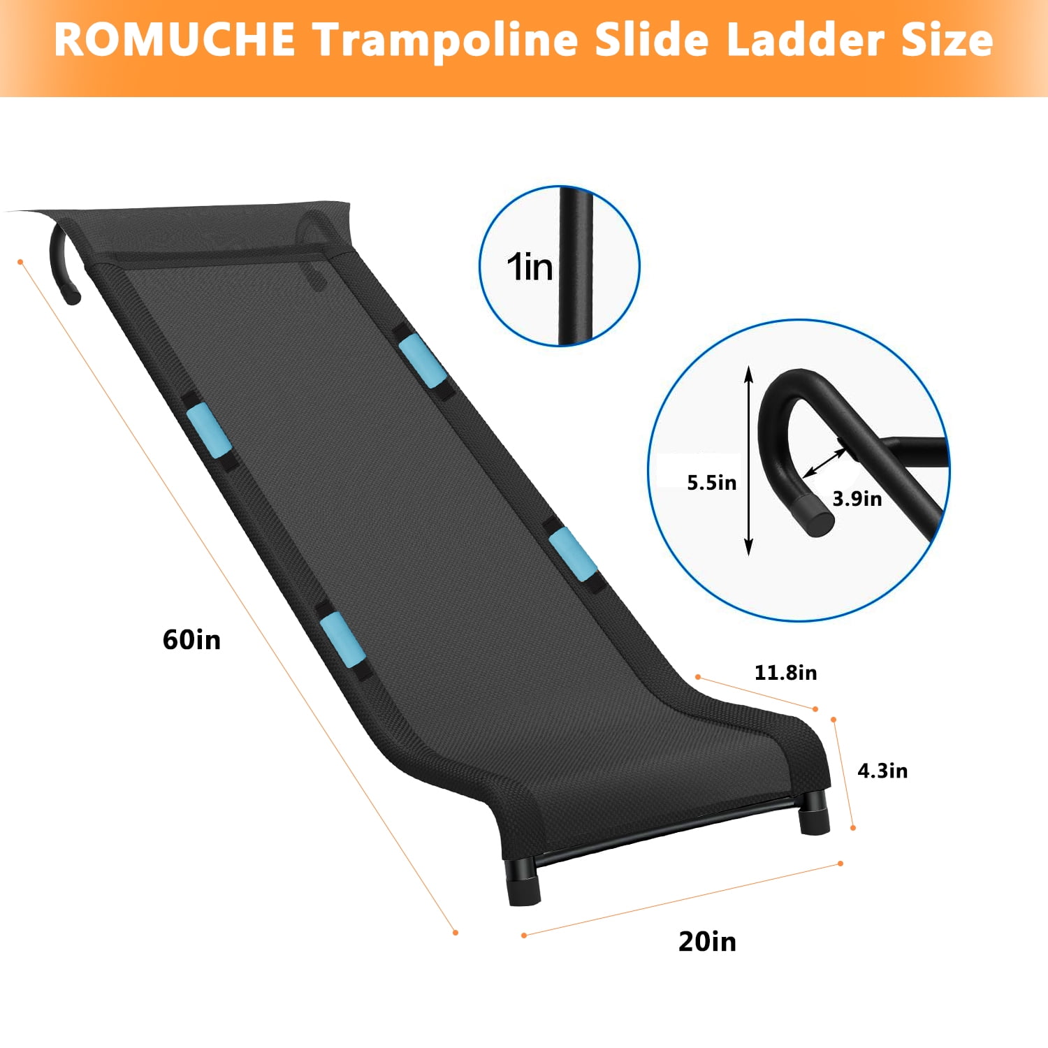 Why Choose ROMUCHE Trampoline Slide? Trampolines are one of the best places for kids to have fun. Our slide for trampoline is just indispensable for playtime. Updated trampoline with slide is designed with cushioning, so that child’s hips won’t fall to the ground when sliding down, providing security for your child’s safety.Reinforced grips on both sides of the trampoline slide allow children to get on and off the slide with minimal effort and safety. The high quality nylon surface and sturdy steel tubing provide the best trampoline accessories for kids. The trampoline slide attachment is a great addition to any trampoline set. Specifications Color: Black/Blue Style: Rock Wall Climber Material: Galvanized Pipe, Nylon Surface Treatment: Plastic Spraying Treatment Educational Objective: Trampolining Wide size:Universal Suggested Users: Unisex-child Weight Capacity: < 75kg/ 165lbs Product Size (L*W): 150*50cm/ 60*20in