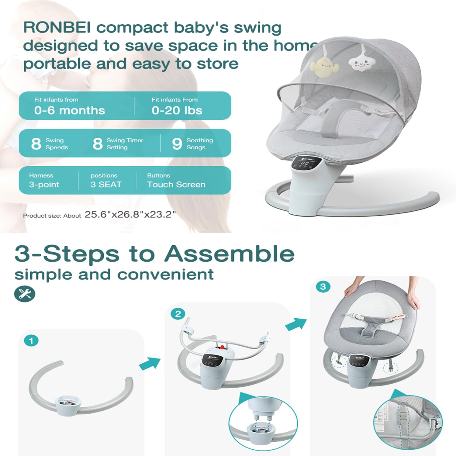 RONBEI 3 IN 1 Baby Swing for Infants Soothe Portable Newborn Swing with Music Remote Control Timing Function Mosquito Net Gray