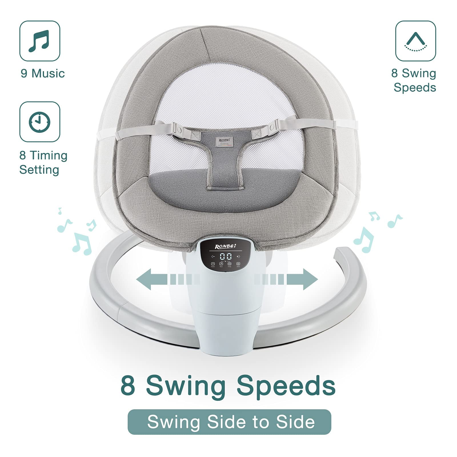 Safe and Reliable: Safety Comes First! Equipped with a 3-point harness safety belt, this compact baby swing for infants can firmly fix your baby to prevent falling down and ensure the baby’s safety. Best for toddlers 0-12 months and below 20 pounds. 8 Swinging Speeds: Our RONBEI baby swing for infants emulates parents’ natural side-to-side motion at 8 different speeds, free your hands and keep baby calm. Two Ways Control and 8 Timing: Parents can easily click on the panel or use the remote control to operate remotely, easily switch music, swing speed, and timer operation. The swing timer has eight settings: 5-40 minutes for mom’s convenience and keeps your baby happy by your side throughout the home. Adjustable Angle and Built-in Music: The baby swing is equipped with 3 levels of adjustment. Adjust the reclining position for maximum comfort and back support for your baby. Choose from 9 songs to help amuse baby. Easy to use and Soft Seat: The installation is a pretty easy task and no additional tools are required. A soft seat cover keeps your baby cozy and the removable infant headrest can be removed as your little one grows. Streamlined arc design appearance and easy-to-clean soft washable seat cover make this swing a favorite of moms.