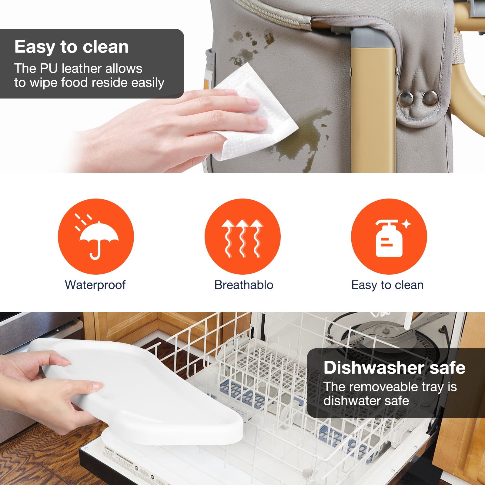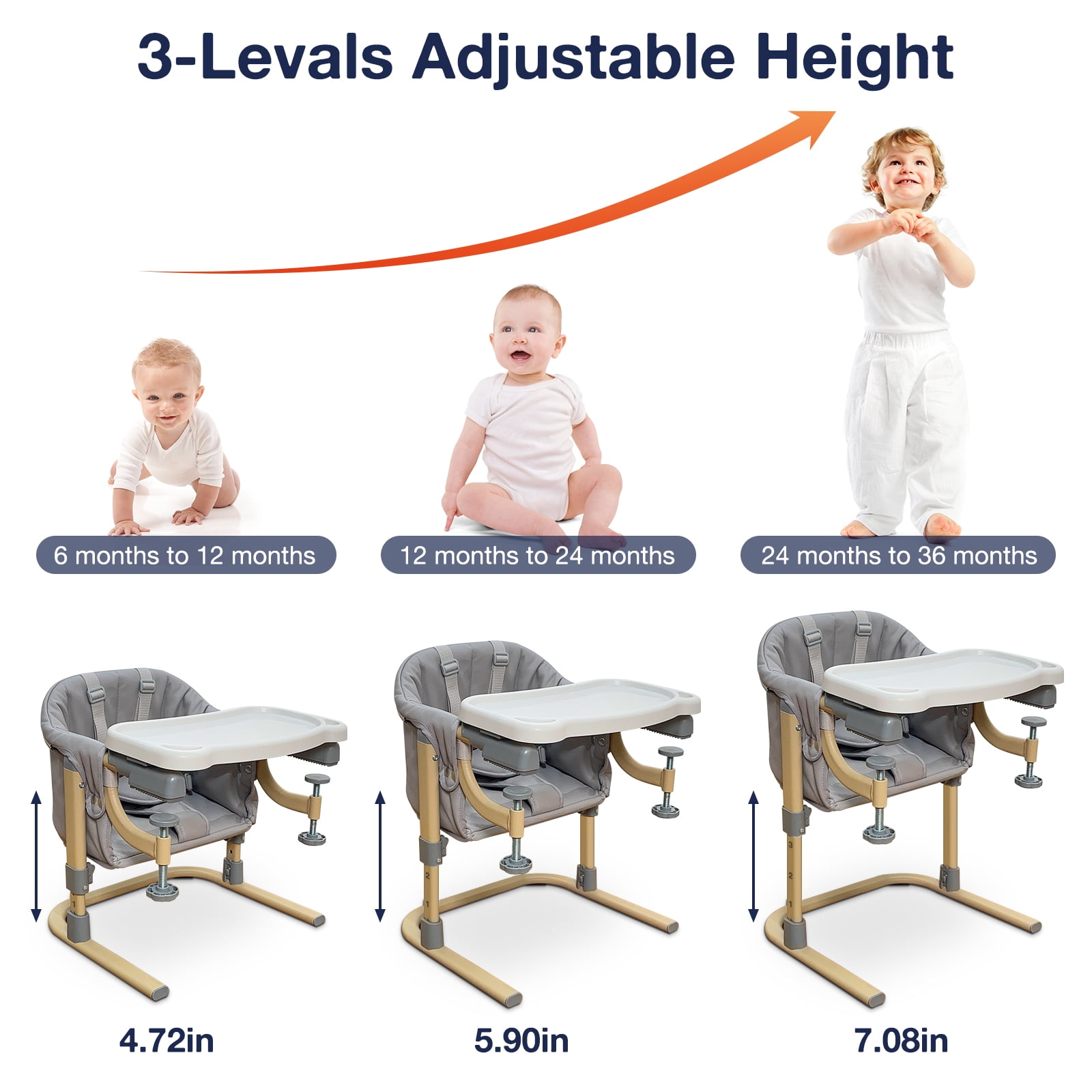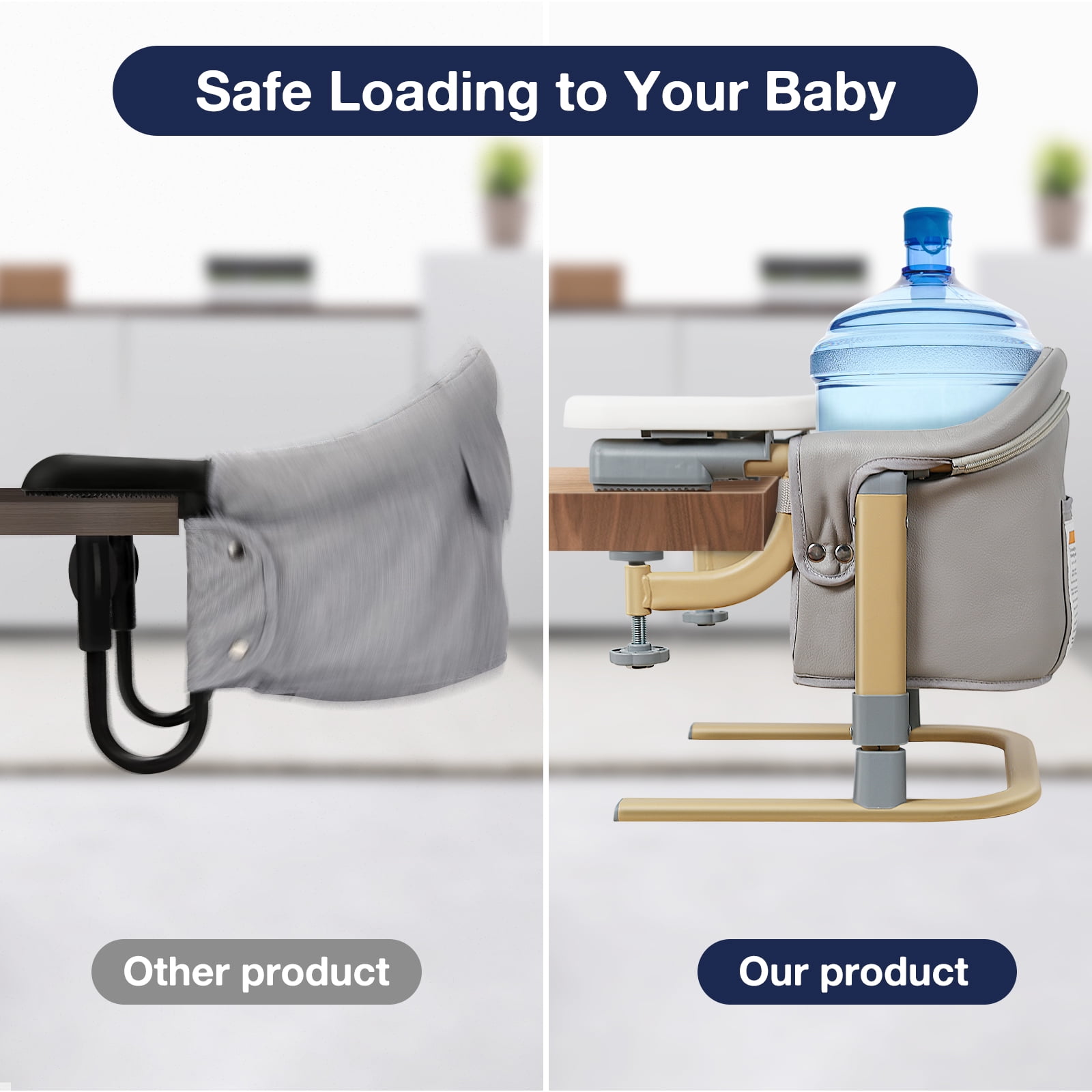 Portable Baby Feeding Chair: This booster seat for kitchen chair can be folded up compactly in the included carrying bag. Also the rear storage pocket ensures immediate access to wipes, snacks, toys, and more. Multifunctional: Whether you’re looking for a fast table chair for your baby, or a kid booster seat for dining chair, or even you want to take it with your family to camp or beach, this multifunctional high chair meets all of these needs! Safe: This clip on chair could hold baby at least 6 months old and up to 33 pounds. The ergonomic metal frame with five-point safety harness and PU leather allows baby to sit in a safe and comfortable space. Easy to Clean: The PU leather fabric can be gently wiped with a damp towel to clean up the food residues left by baby. And the dining tray can be removed and supports dishwasher cleaning. Adjustable Height: This baby hook on chair can be easily adjusted in 3 levels to accommodate tables of different heights and usage scenarios, and to adapt to the different growth stages of your baby.