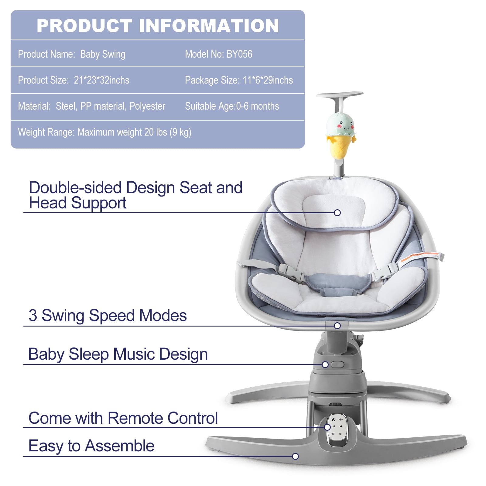 RONBEI Baby Swing for Infants, Portable Swing with Music Playing, Unisex Baby Bouncer, Baby Swing for Home Travel The RONBEI understand the hardships of being a parent and tries its best to provide solutions for new parents. Our Baby Swing is a must-have helper to free parents’ hands. This baby swing imitates the mother’s embrace and protects the baby’s spine, and imitates the calming side-to-side swaying motion most babies love. Whether you sit on a couch or lay on a bed, you can control the motion, music, and time of the swing by remote control. Features: 3 swing speeds for more soothing options. Removable Double-Sided fabric seat. Comes with bluetooth speaker for palying music Specification: Color: Deep/Light Gray Brand: RONBEI Gender:Unisex Product Dimension: 27.1″ x 22.6″ x 31.5″ (L x W x H) Fabric material: Peach skin, cationic, polyester Main material: Steel pipe + plastic Product Weight: About 11 LBS Suitable Age: 0-12 Months Wireless Technology: Bluetooth