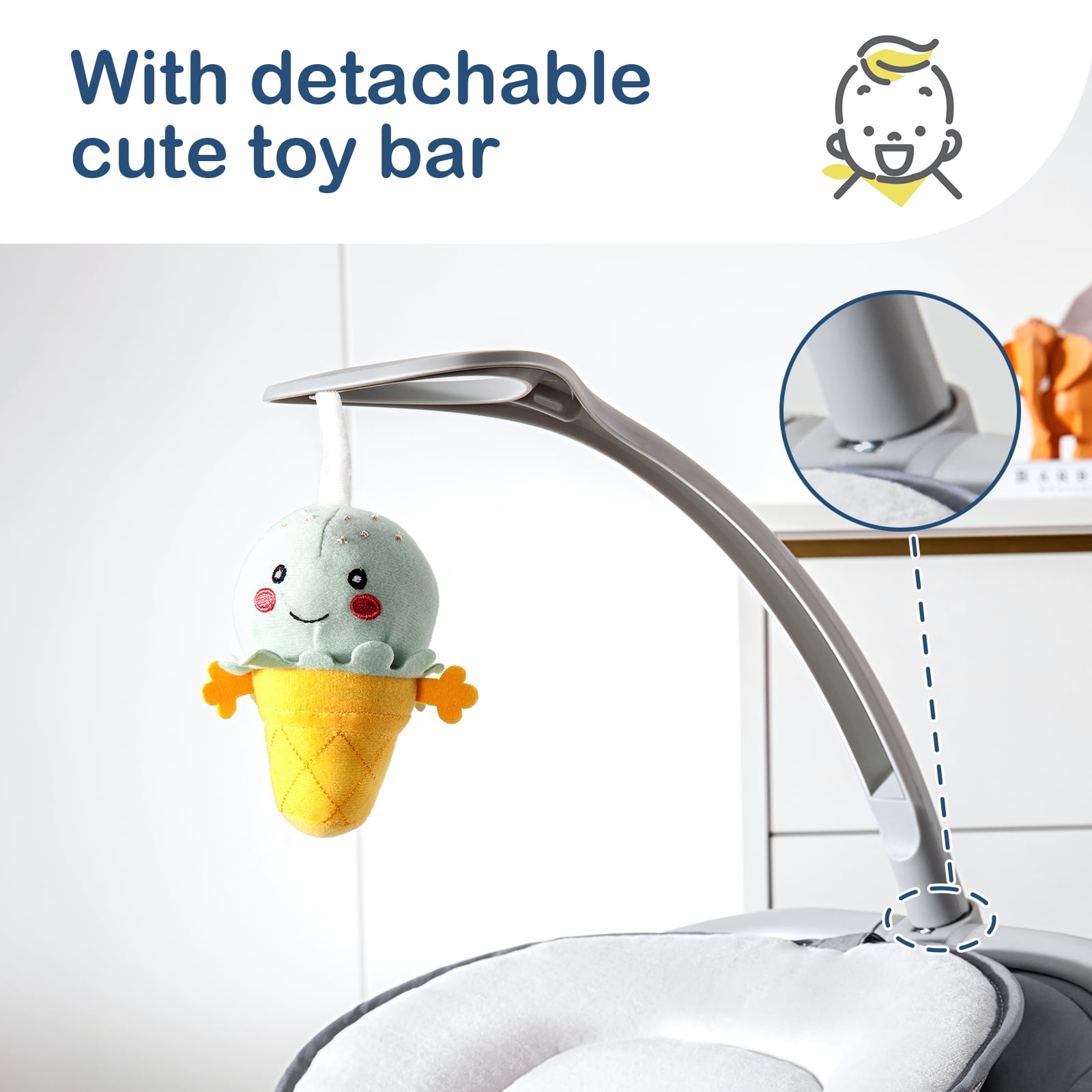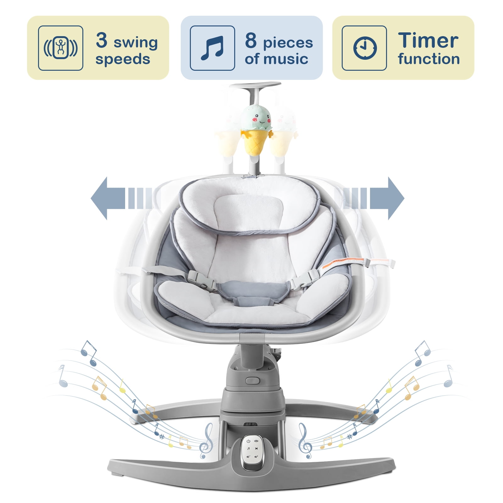 【Thoughtful Design】The baby swing chair for infants comes with bluetooth speaker, built-in 8 pieces of music songs. RONBEI Baby Swing maintains 3 swing speeds with quiet motor. Free adjustable seat position, our baby swing can be adjusted to any seat height to make baby sit more comfortable (the highest seat position is 24°, the lowest seat position is 10°). 【Two-sided design baby swing mat】 One side is made of cationic cotton, the other is made of polyester fiber mesh surface, with air permeability, wear resistance and comfort. The soft and breathable cushion is not only removable but also machine washable to protect the mother’s hands from harm. 【Safe and Reliable】Safety Comes First! Equipped with a 3-point harness safety belt, this compact baby swing for infants can firmly fix your baby to prevent falling down and ensure the baby’s safety. The arc design of the bracket is more conducive to the stability of the baby swing and plays a non-slip role. 【Portable and Lightweight】This baby swing can be used indoors or outdoors. The baby Rocker is lightweight, making it easy to move around. You can keep a close eye on and care for your baby anywhere. It’s easy to assemble and disassemble,and its travel size, makes it perfect for going out on trips with your lovely baby.
