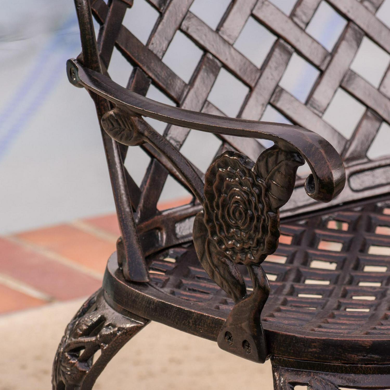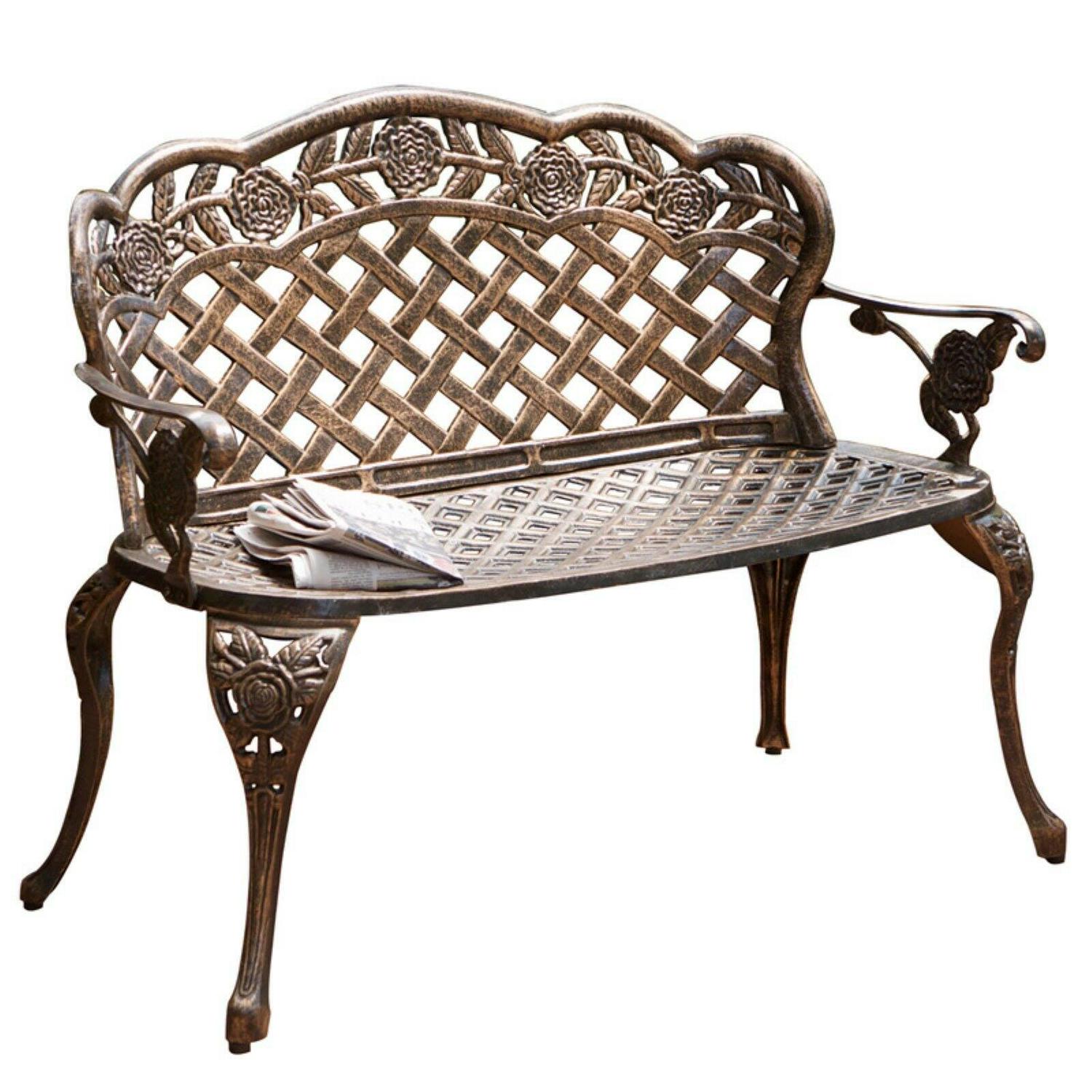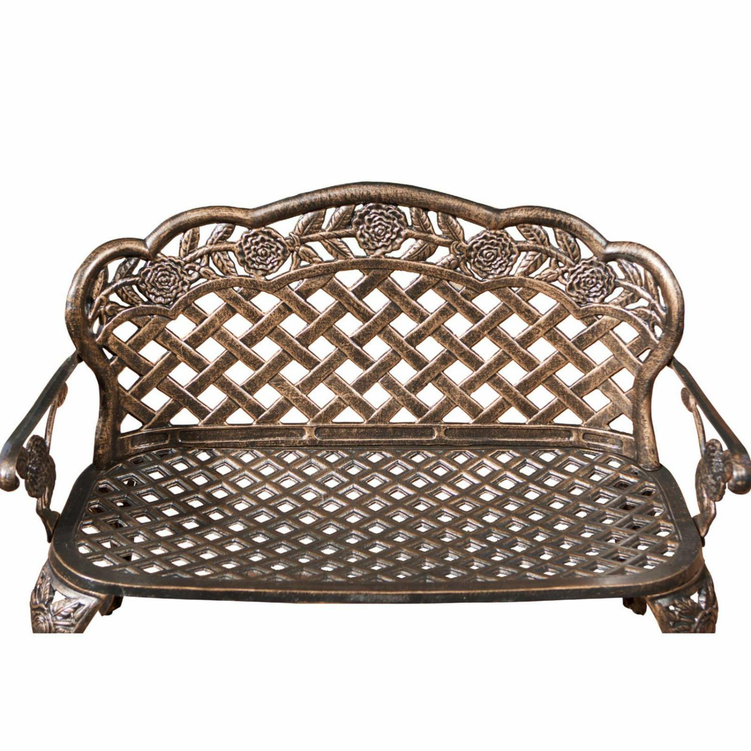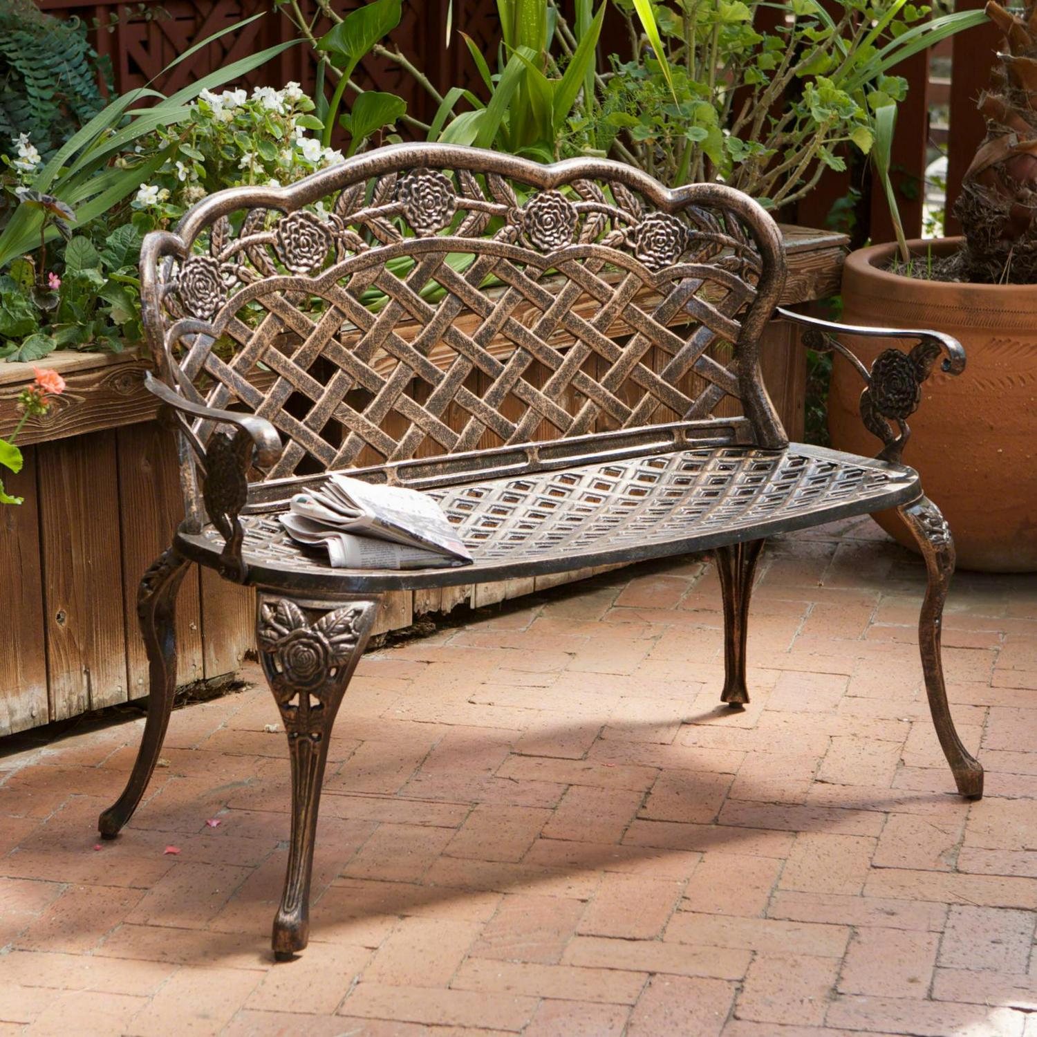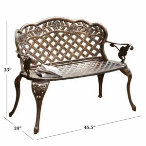 Suitable for both indoor and outdoor use, the Rose and Lattice Cast Aluminum Antique Copper Outdoor Garden Bench features a tough construction that is highly durable. This all-weather and rust-proof bench is made of cast aluminum. It’s ideal for welcoming your guests in your backyard, garden, or on your porch. Featuring an attractive lattice pattern, this bench has an antique copper finish that lends it a vintage appeal. The wide stance of the legs provides good stability for a comfortable seating experience.