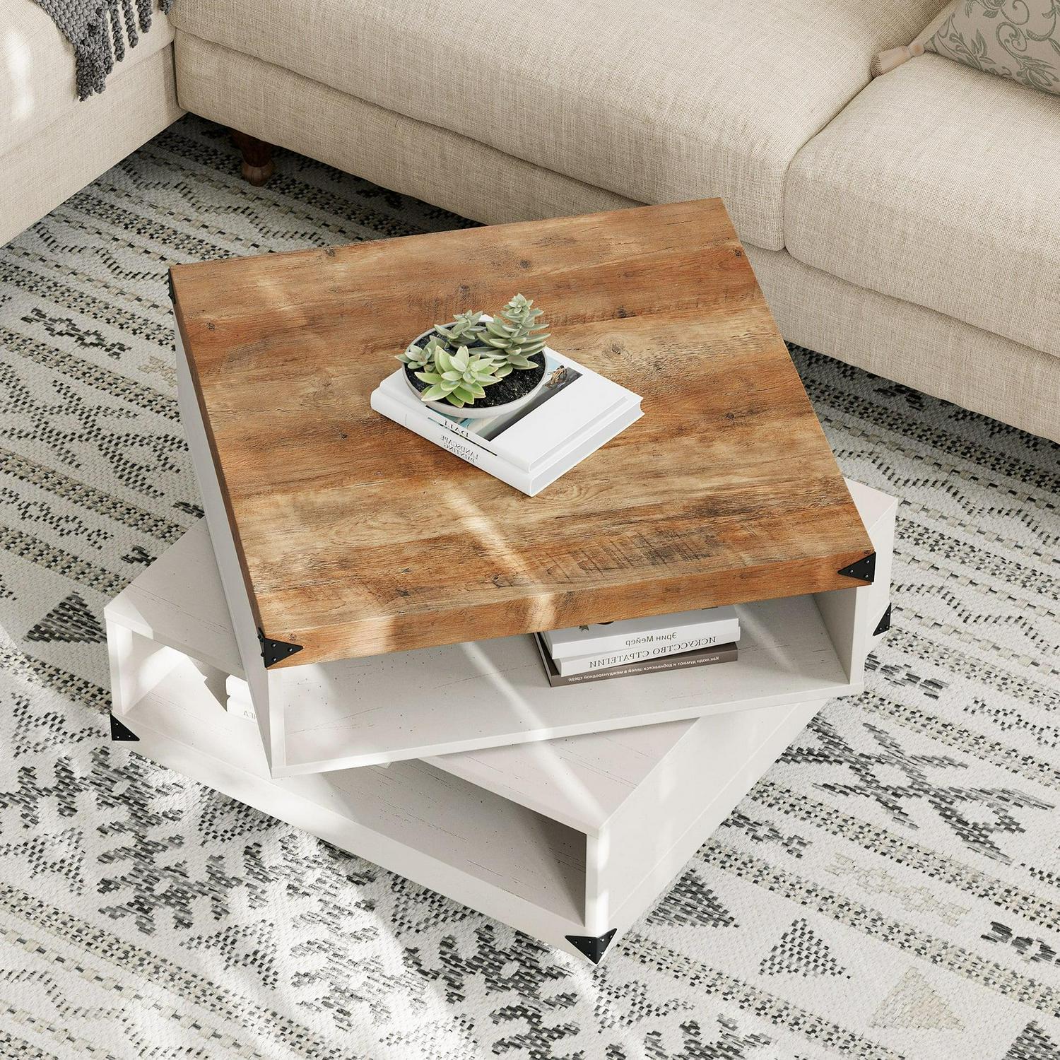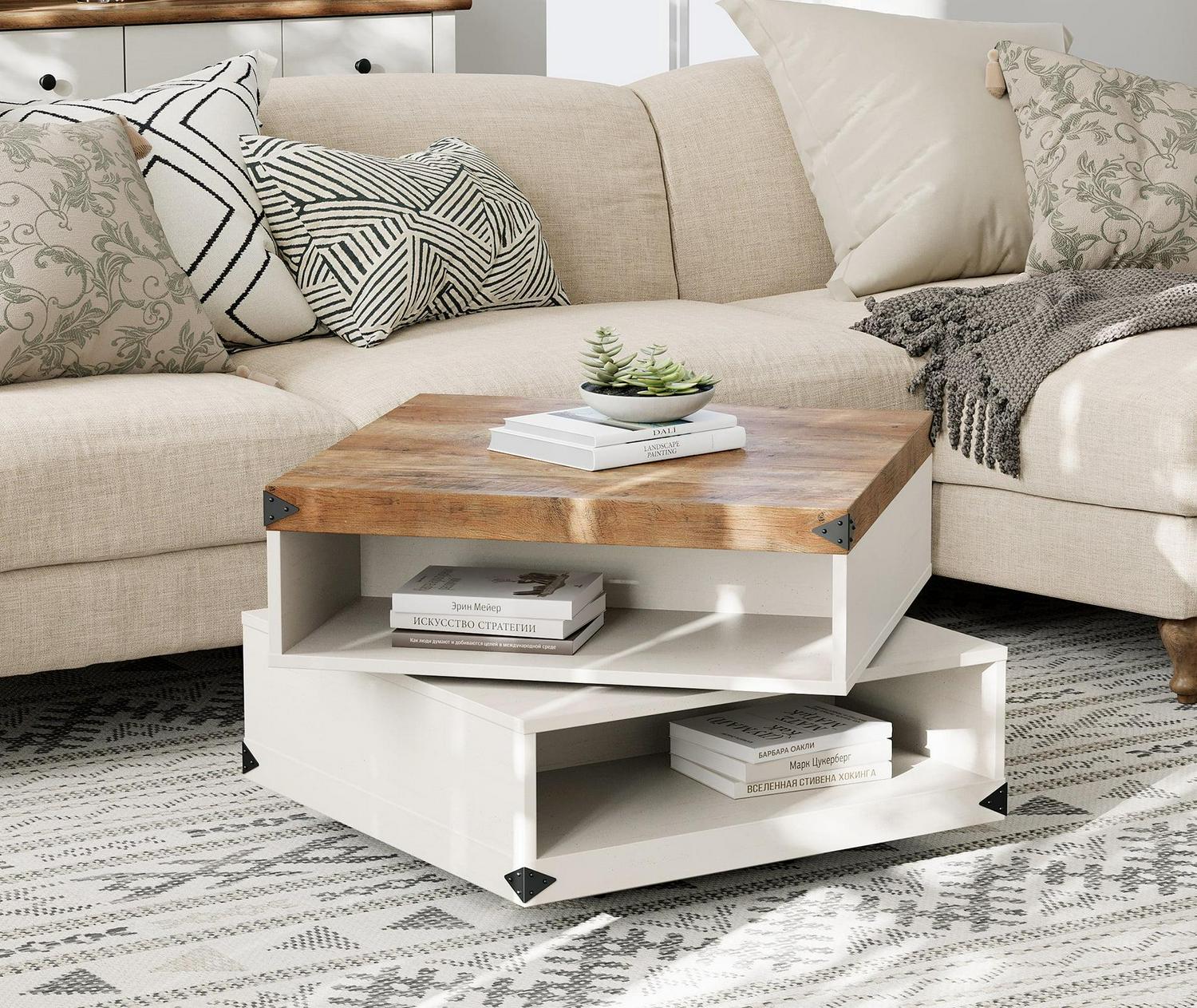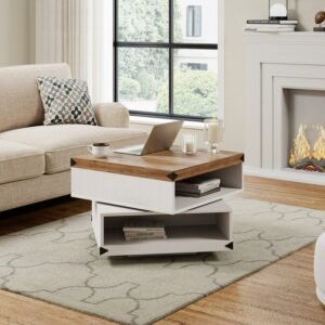 Made of special rustic white laminated wood with rich woodgrain, the coffe table looks vintage and elegant. Matches well with your rustic or industrial style home decor. The top of this coffee table with storage is rotatable for 360°.You can adjust them to any angle with your needs. And all the items are easy to reach. It is not a simple tea table. It brings a lot of fun to you. Buy it now.2 Open cubbies on each cubic platform offer enough storage spaces and it is very convenient due to 360° rotating function. Square table top(25.5″ L) is spacious to place your coffee cups or display your favorite arts, books, plants etc.