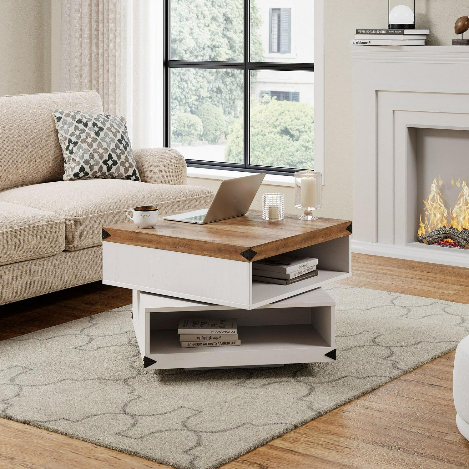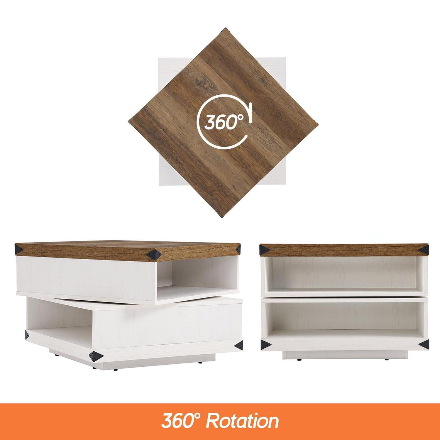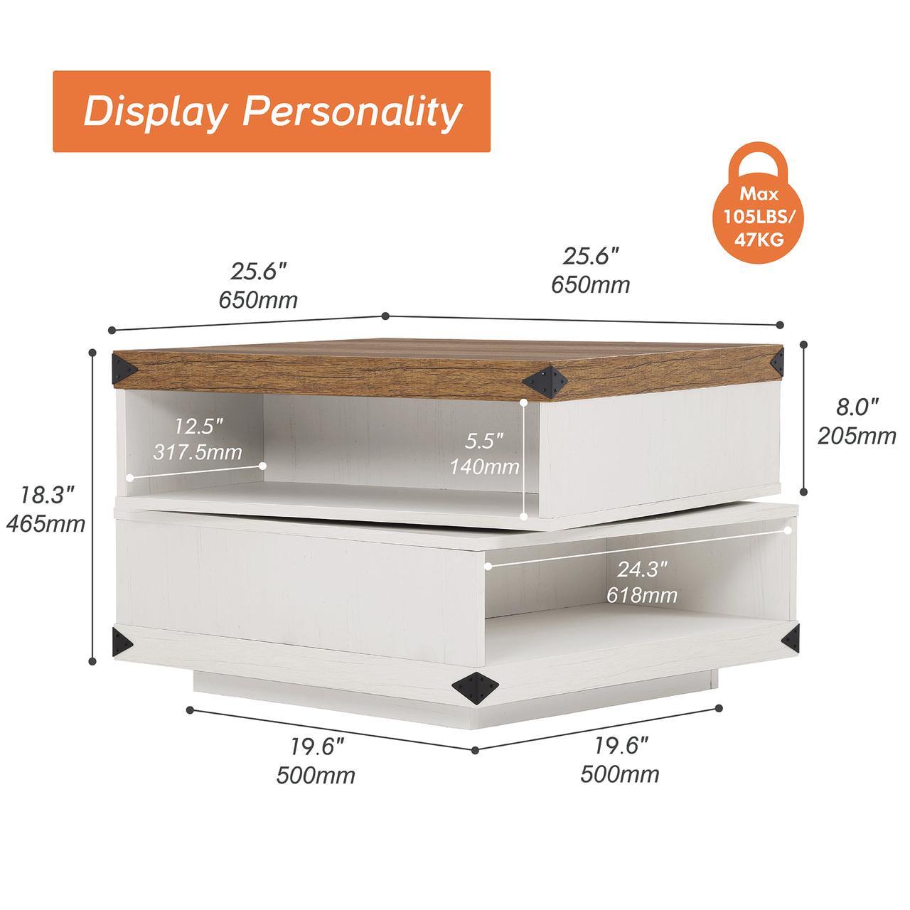 Rotatable Coffee Table with 4 Cubbies, Square Wood Accent Tea Center Table for Living Room, White&Oak, 25.5