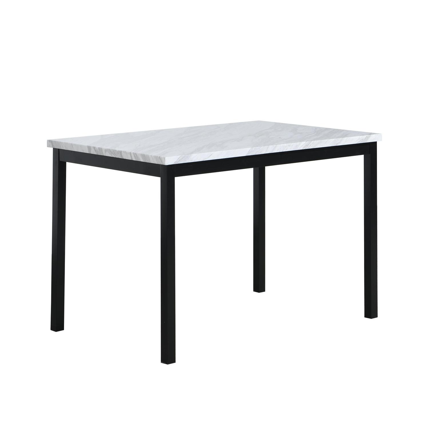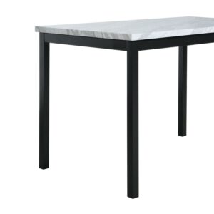 This sleek and charming Roundhill Furniture Citico Metal 5-Piece Dinette Set with Gray Chairs is sure to bring contemporary flair to your space. The slender, compact silhouette works wonderfully in smaller homes while delivering a posh and bold focal point. A faux-marble top and chic gray faux leather coalesce to bring a little glamour that you are sure to adore. The metal base makes this a long-lasting set for your dining room.