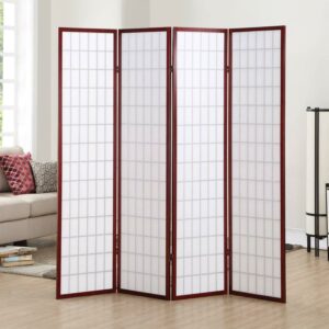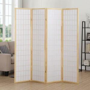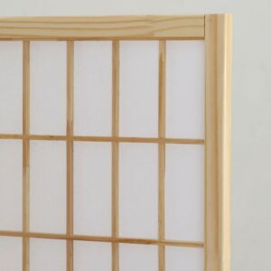 Inspired by Japanese sensibility and design, this room divider is suited to creating privacy in small spaces. The lightweight but stable frame is made of solid wood and finished in your choice of yellow, black, and brown to complement the white paneling. Features: Product Features: FoldableMaterial: WoodStyle: 4 Panel, ContemporaryAssembly: AssembledColor: White, Black, Yellow, BrownEach panel is 18 inches wide x 71 inche shighThe digital images we display have the most accurate color possible. However, due to differences in computer monitors, we cannot be responsible for variations in color between the actual product and your screen.