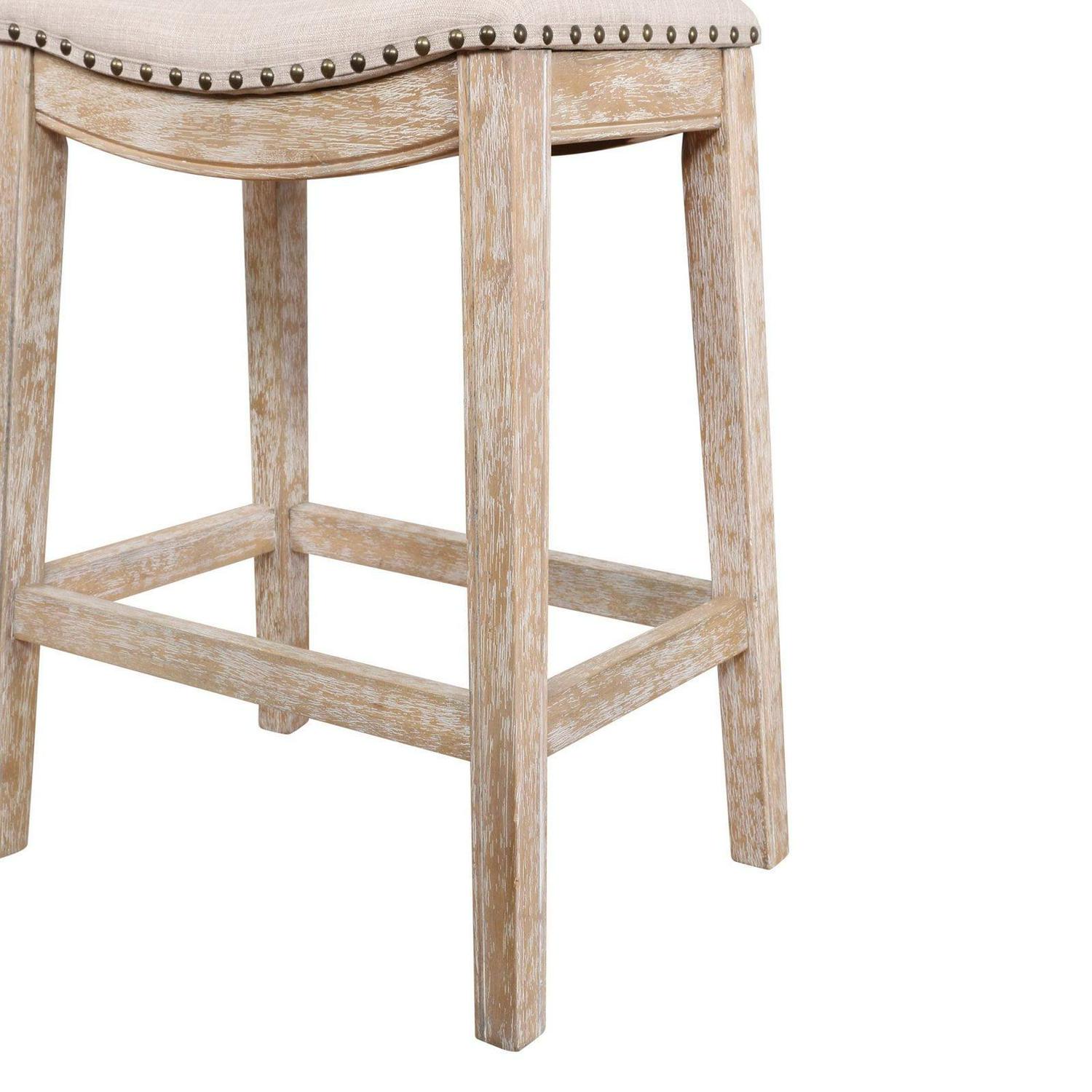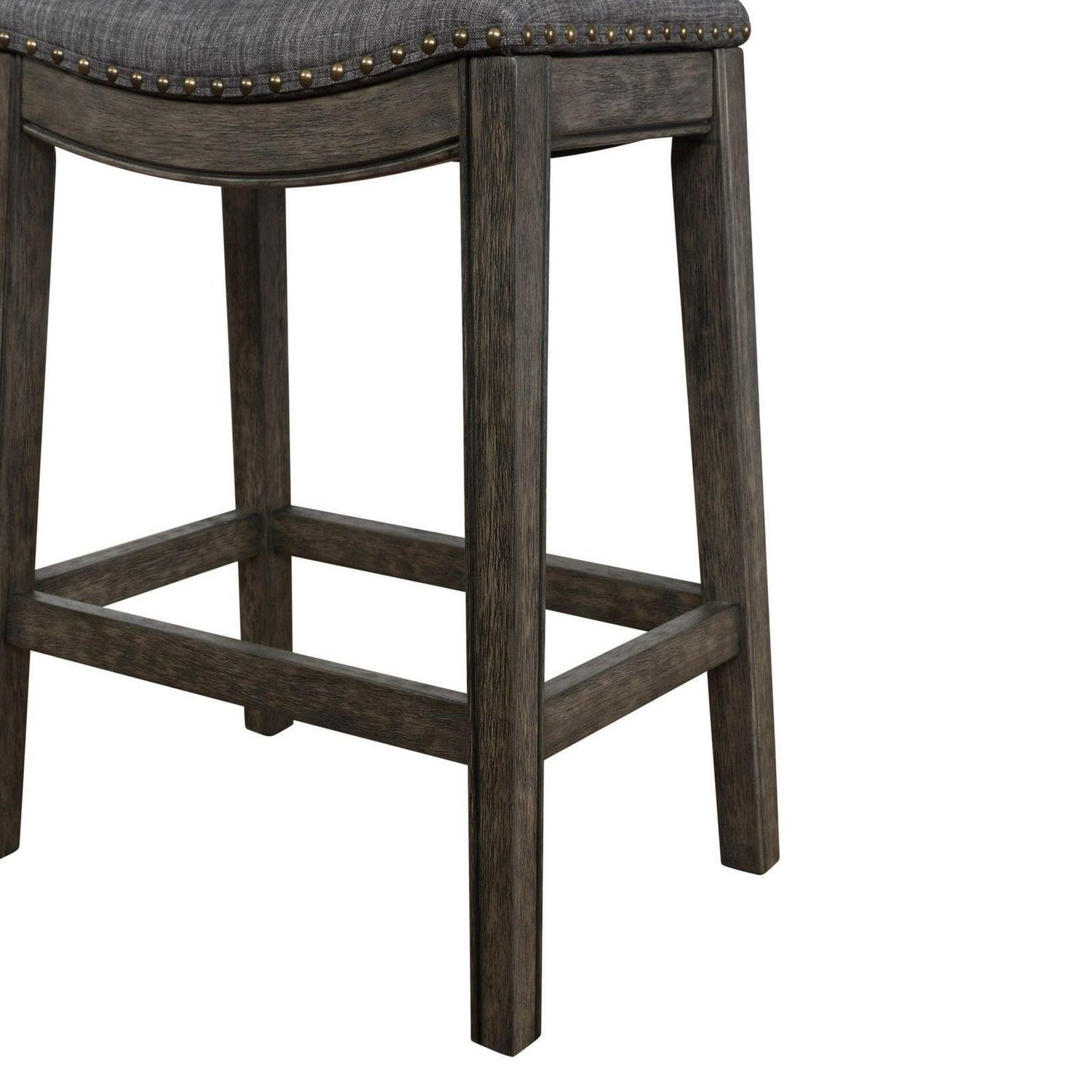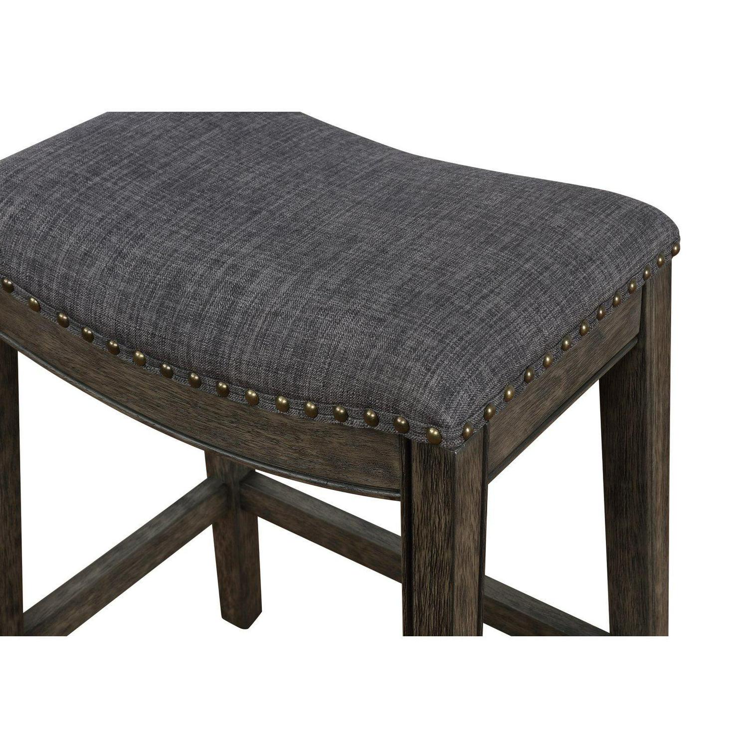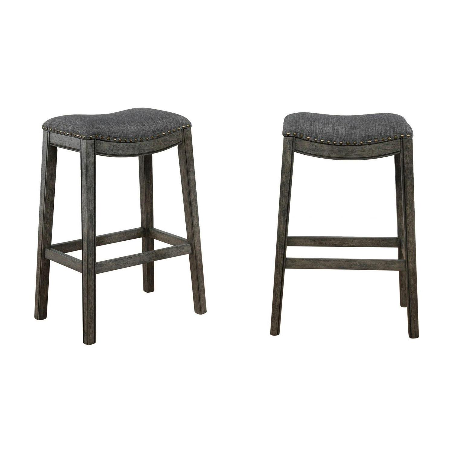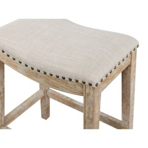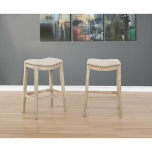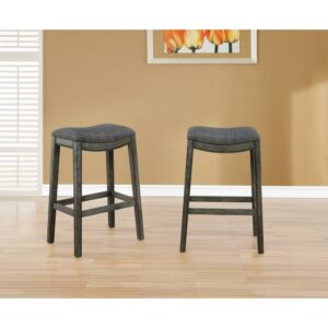 Update your in-home eatery’s rustic aesthetic with the Roundhill Furniture Maroni Upholstered Saddle Bar Stool with Nailhead Trim – Set of 2. This bar-height set includes two stools crafted from sturdy wood and padded with thick, cushiony foam. Smooth fabric stretches across a saddle-style seat in your choice of available colors. Nailhead details around the edge of the seat offer a sophisticated finishing touch to these weathered wood stools. Some assembly required.