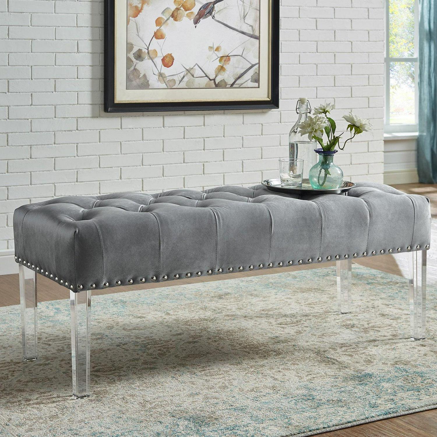 Plush and upholstered in a velvet textured polyester fabric, the Roundhill Furniture Valley Button Tufted Indoor Bench makes a fine addition to the foot of your bed or your home’s entryway. Button tufting and silver-tone nailhead trim add a decorative touch. The bench’s four acrylic legs are clear, giving the illusion that the bench is floating in midair. Choose an available upholstery color that complements your home.
