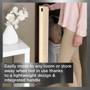 Discover a tower fan made for contemporary urban settings, thanks to a stunning wood aesthetic and ultra-slim design. Harnessing powerful airflow, it delivers optimum freshness with no compromise on performance all while looking great! Enjoy a personalized feeling of freshness adapted to any situation Choose from 3 speeds, 2 modes, as well as oscillating or focused airflow. Then transport from room to room and store away with ease, thanks to the lightweight design and integrated handle.