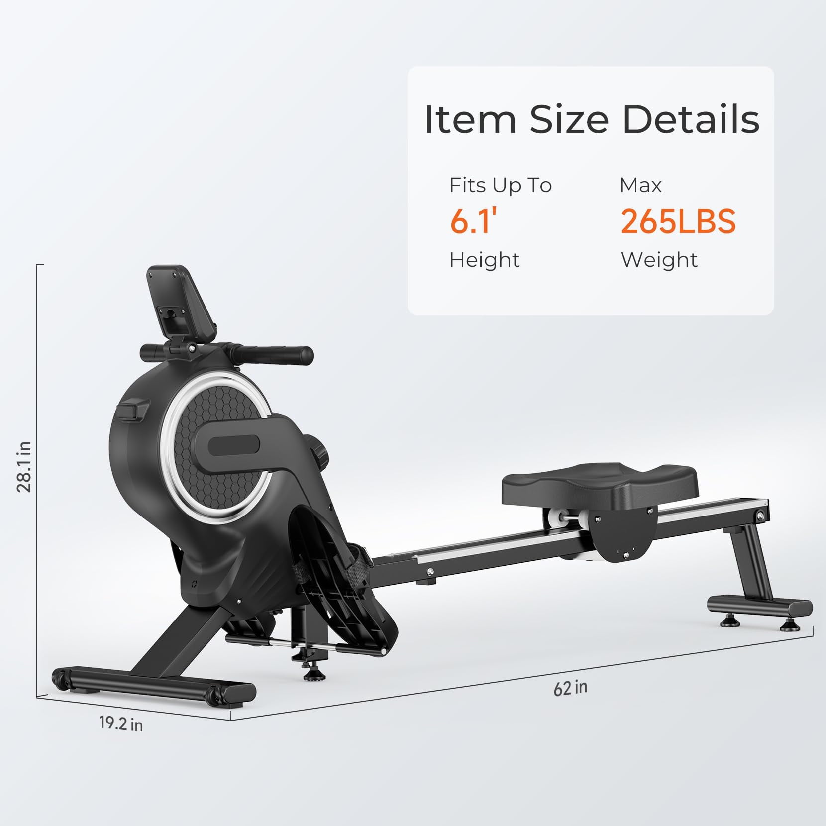 Neche Rowing Machine Tackle your fitness goals and experience a low impact, full-body workout . Engage your quads as you propel your legs back and forth on the ergonomic pivoting foot pedals. The Oversized foot pedals move forward and backward with your feet to promote a powerful push that is sure to fire up those leg muscles. Grasp the foam-padded handlebar and begin your rowing workout. Crank up to 16 levels of magnetic resistance creating smooth and silent rows each time you pull. The large, sweat-resistant seat supports you during long exercise sessions keeping you comfortable and focused. The sturdy slide rail and frame support up to 265lb. Progress is key to keeping you motivated. Check out all your fitness stats on the easy to read monitor displaying time, speed, count, calories burned, total count, and count per minute. 💗🏃Total Body Muscle Workout:This rowing machine is equipped with a high quality magnetic control system that provides enough resistance.16 levels of resistance can be well transitioned, whether you are a beginner or an advanced user, you can get an effective workout. 💗🏃Super Quiet Rower:Non-contact magnetic resistance system delivers a virtually silent rowing experience. High-density steel reduces noise and turns daily rowing into a pleasure. Whether it’s early in the morning or after work, you can enjoy your workout without worry. Choose a rower that will grow with you, from beginner to advanced. 💗🏃Well-Made and Durable:Maximum weight capacity is up to 265 lbs. The product is designed to be sturdy and durable. 💗🏃Oversized Monitor and Tablet Holder:New Bluetooth support allows you to experience different rowing scenarios and the fun of rowing competitions. 💗🏃Humanized Design:The magnetic rower has a small footprint and saves 70% of storage space when stored upright. Two large transportation wheels make it. 💗🏃Max Weight: 265 lbs 💗🏃Assembled Size: 62″x19.2″x28.1″ 💗🏃Resistance: 16 Level Adjustable Magnetic Resistance