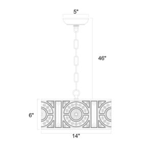 Description: Brighten your dining space at home with this 4-light chandelier. Covered by a cylindrical metal shade with crystal decorations that accentuates the light from the four bulbs. Features: Lighting Type: Chandelier Fixture Finish: Antique Bronze Shade Material: Metal Shade Color: Antique Bronze Setting: Indoor Number of Lights: Four (4) Bulb Type: 60-W E12 (not included) Hardwired Dimensions: Overall: Ø 14 x H 52 inches Fixture: Ø 14 x H 6 inches Canopy: D 5 x H 1 inches Chain/Wire Length: 46 inches
