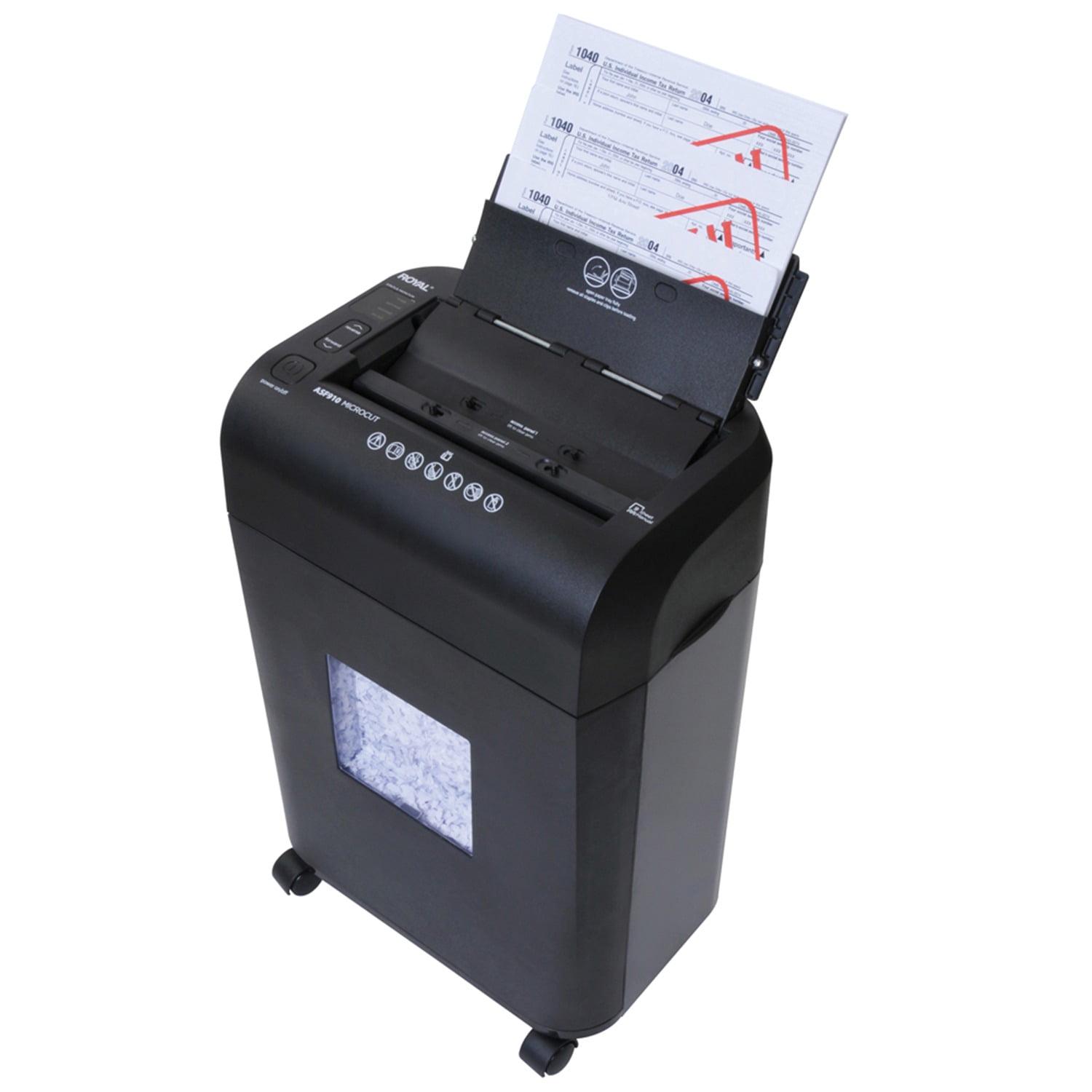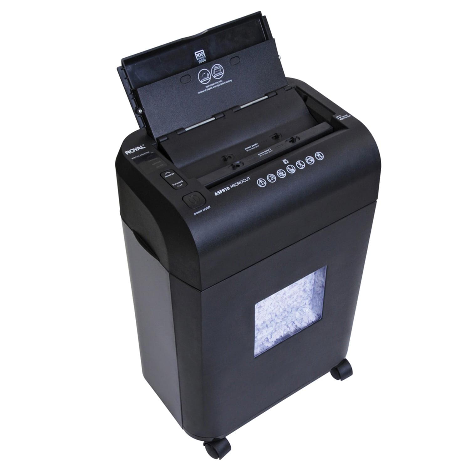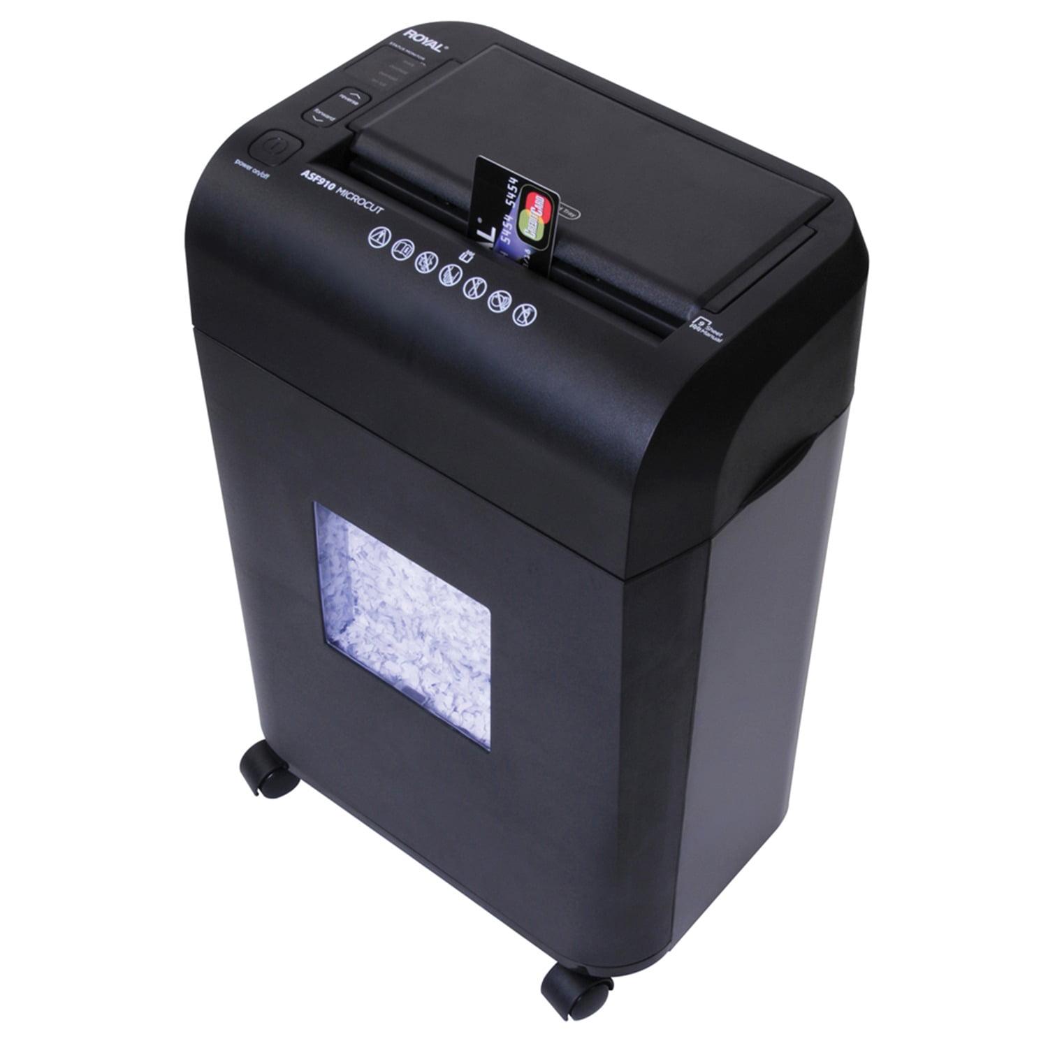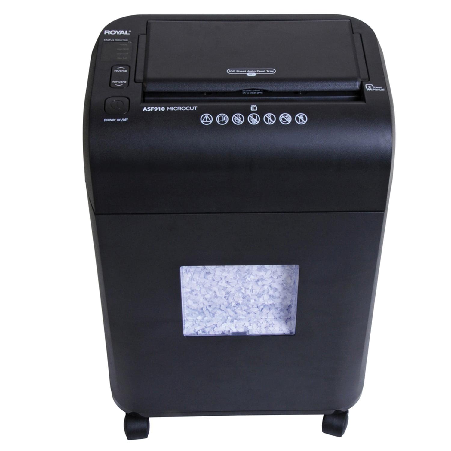 The Royal ASF910 Micro cut Auto feed Shredder does the work for you by shredding each page until the auto-feeder is empty. This shredder includes manual slots that accept up to 9 sheets of bond paper at a pass and expired credit cards as well. The large 4.5 gallon pull-out waste bin holds hundreds of shredded pages, and the shredder boasts casters for easy mobility. The SF910 features micro cut technology, reducing paper to tiny chips ensuring destruction of the most sensitive of documents.