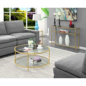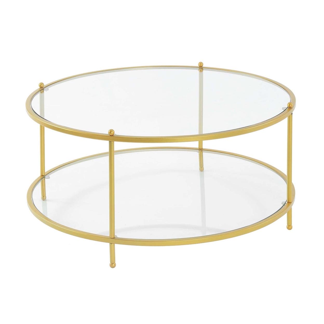 Royal Crest 2 Tier Round Glass Coffee Table Update your home decor with a little sparkle from the Royal Crest 2 Tier Round Glass Coffee Table from Convenience Concepts. Its perfectly circular design will add fun and glamour to your everyday living space. Made up of clear sturdy tempered glass; framed with chrome metal; this coffee table is built to last. Subtle details from the rounded tops and tapered legs ensure that every detail is carefully thought out to provide an elegant look that is sure to be timeless. The bottom shelf offers additional space to allow you to display or store everything from your board games to fashion magazines; helping to optimize your living space. Witness as your curvilinear table creates open space in your home with a touch of elegance and glamour that you were missing. Complete your look with other items from the Royal Crest Collection from Convenience Concepts.