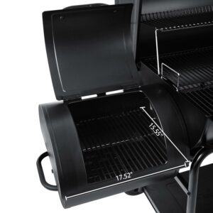 – Side Charcoal Door: Easy to tend the charcoal up to 1.2kg/2.6 lb. with the heavy duty handle on the offset smoker, no worries for insufficient coal and no need to remove the entire grates.
