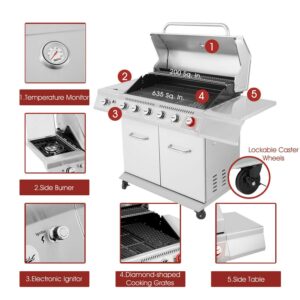 Royal Gourmet GA6402S Stainless Steel Gas Grill, Premier 6-Burner BBQ Grill with Sear Burner and Side Burner, 74,000 BTU, Cabinet Style, Outdoor Party Grill, Silver