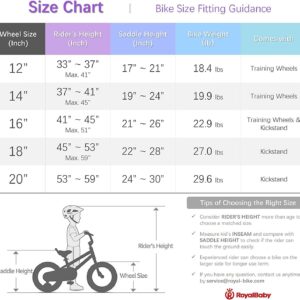 5. More size options! 12,14,16,18,20 Inch available, the handlebars and seat height are all adjustable. Use our easy-to-follow size chart, you ll find a perfect size for your little beloved. Note: Please take the kids height into consideration.