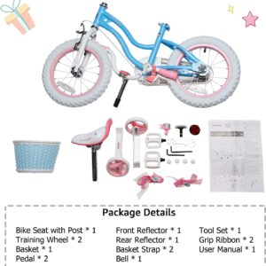 – SPECIFICALLY FOR GIRLS Royalbaby girls bike has a low geometry delicate curve frame, easy for kids to hop on. Cute bike in lovely colors and details, dual brakes (pedal and hand), detachable height-adjustable wider training wheels for excellent steadiness, a bell, and a basket for her dolls. It’s a great first bike with all the bells and whistles a child will need to learn and get comfortable with biking.