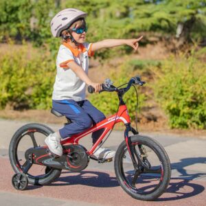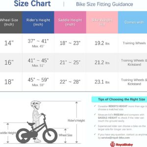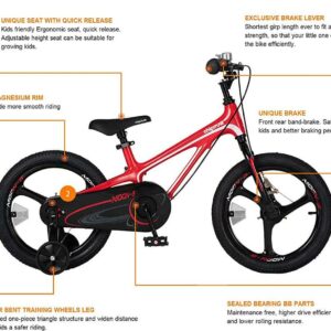 Let your little ones enjoy the outdoors and kindle their love for cycling with the RoyalBaby Moon-5 18-Inch Kids Bike with Kickstand. With a sleek design, this bike for boys and girls is a masterpiece that will capture your child’s adventurous heart. Alongside a robust, lightweight magnesium frame and extra-wide tires, this bike guarantees a secured journey for your little one on every adventure, bringing them back home sound and intact. This bike with training wheels features 14-inch tires that allow your child to learn and grow at their own pace. The dependable dual handbrake provides confident braking performance in various weather conditions for worry-free adventures outdoors. Meanwhile, the extra-wide tires deliver increased stability and traction, allowing young riders to confidently navigate different terrains while providing a smooth and comfortable ride for endless outdoor fun. This bike features a kickstand, RoyalBaby exclusive premium parts, and magnesium 1-piece rim, making it an exceptional all-in-one bike option. Watch your child soar to new heights, pedaling through your neighborhood with the RoyalBaby Moon-5 18-Inch Kids Bike.