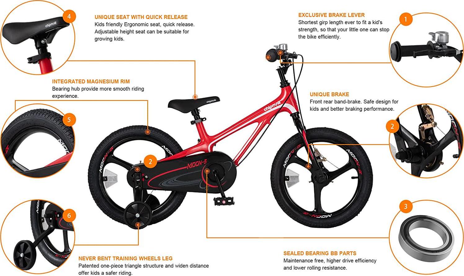 – Lightweight kid’s bike features a moon-inspired design with kickstand