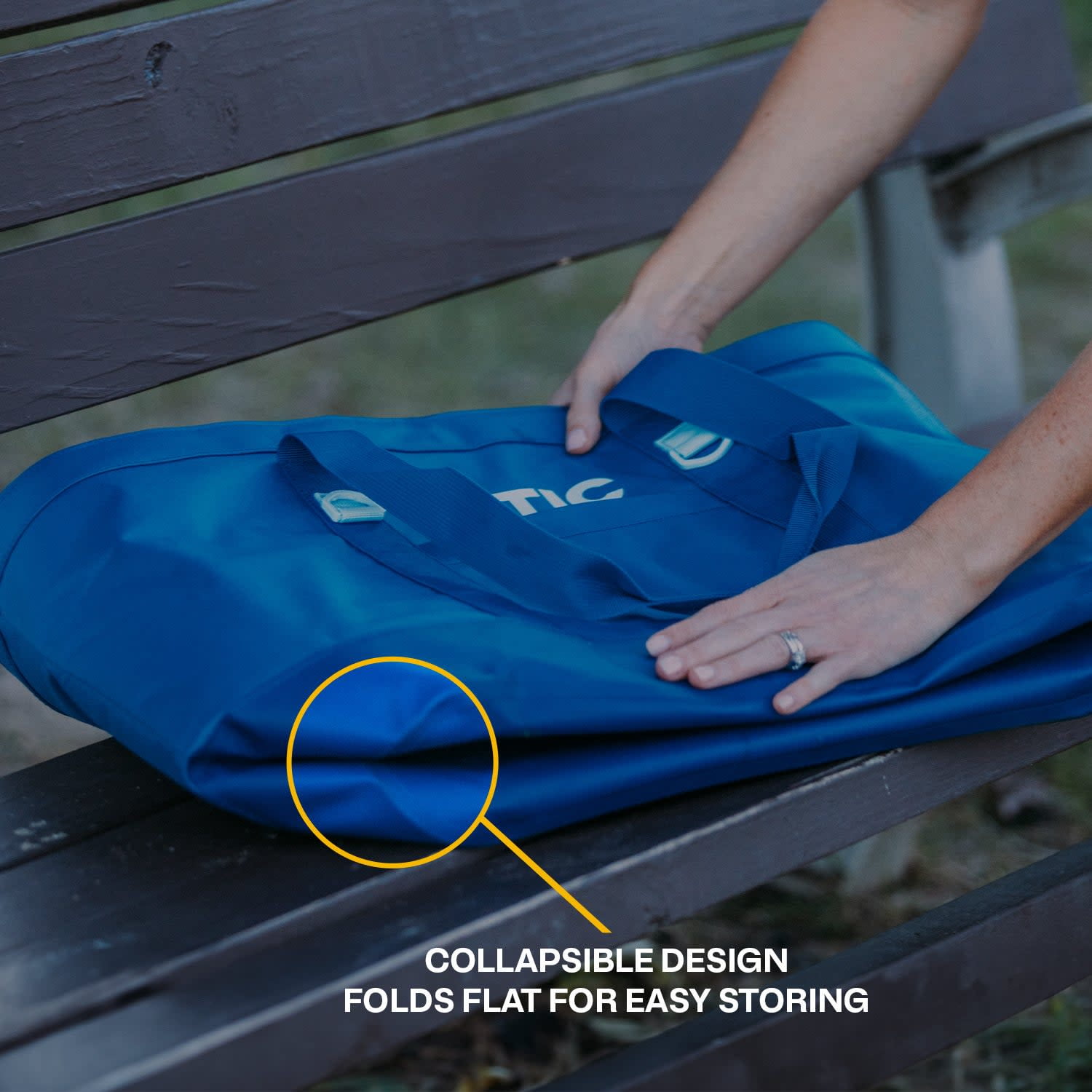 Leakproof Durable Design features a waterproof base and interior lining made with welded seams. Insulated Interior with welded seams keeps contents cold and leak free. Collapsible Design folds down flat for easy storing. Waterproof Welded Bottom protects from wet surfaces, while keeping the tote upright. Durable Exterior features PVC-free coated waterproof fabric for easy cleaning.