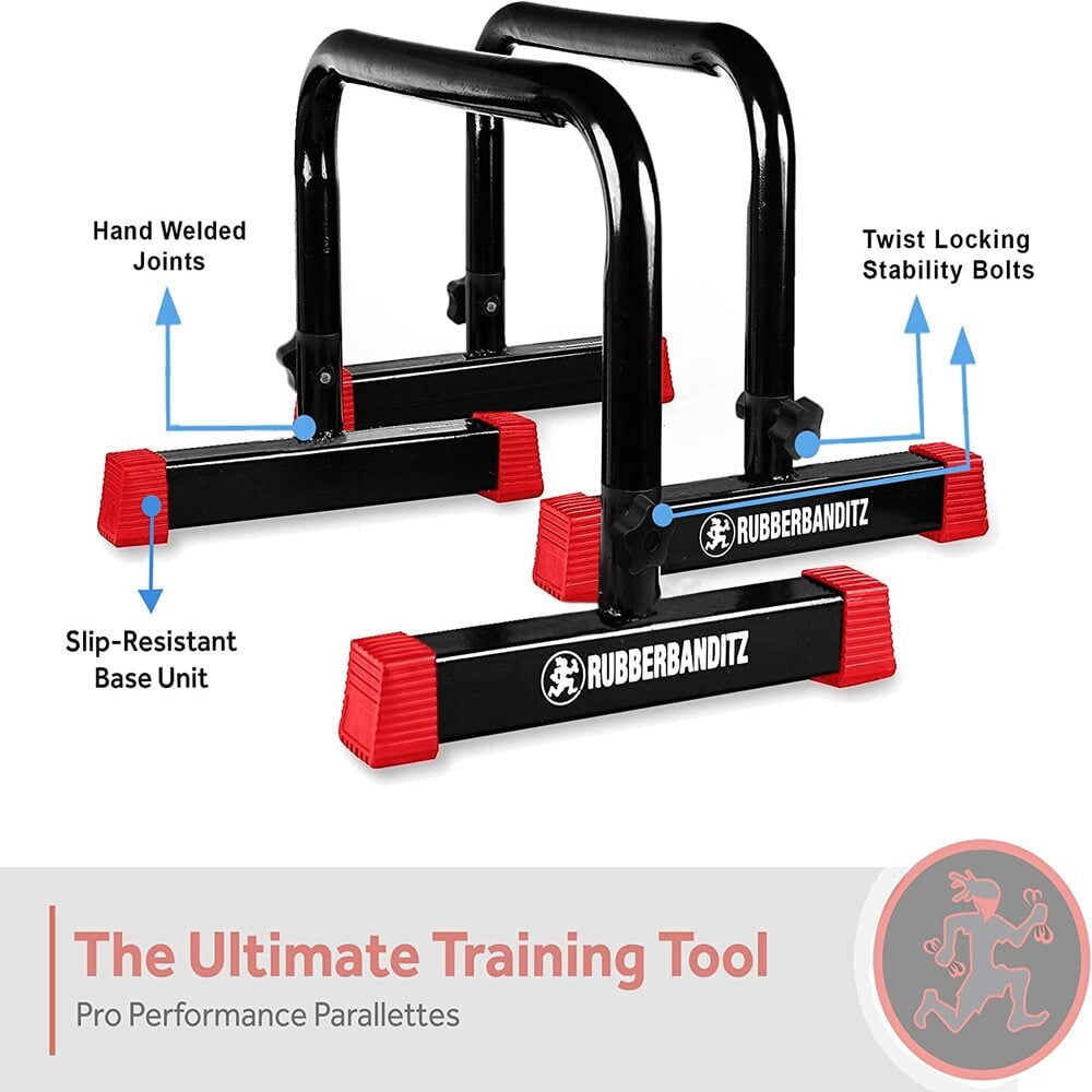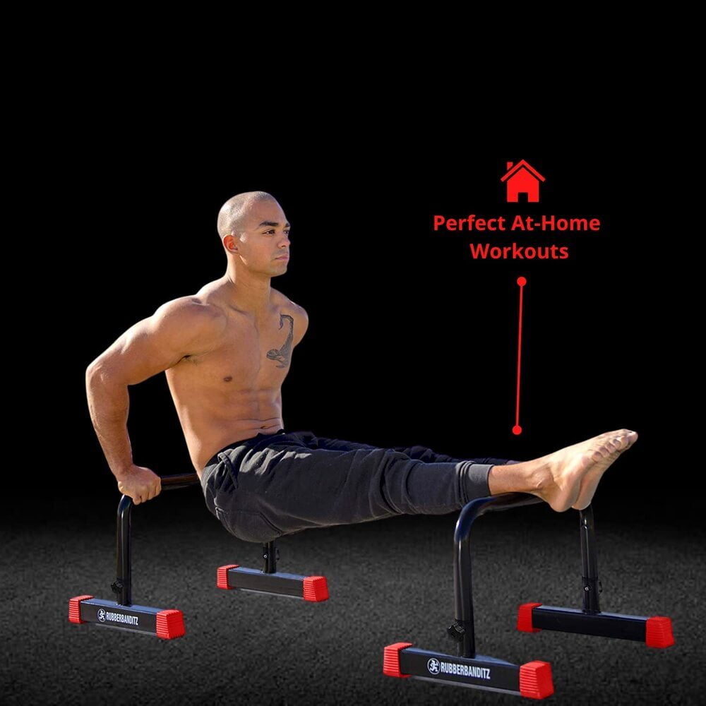 Nothing beats a good home workout—provided you have the right home equipment. If you’re searching for an easy and effective upper body exercise solution for your home, gym, or office, there is no better choice than these heavy-duty parallettes pushup bars from our RubberBanditz exercise experts. Engineered for ergonomic performance, workout versatility, and superior durability, these easy-to-use parallel bars are an all-in-one upper body solution that allows users to properly execute pushups, dips, L-sits, handstands, planche progressions and a host of other upper body and CrossFit workouts. Great for all fitness levels and all budgets, they’re a must-have for any bodyweight training enthusiasts.What separates these heavy-duty parallettes pushup bars from the competition is their superior design and exceptional overall build quality. The problem with many parallettes and pushup bars is their flimsiness and unpredictable durability. When you try to exercise, they can slide around or break altogether. Manufactured with industrial-grade solid steel and designed for unparalleled durability, these parallettes pushup bars are built to last a lifetime. They’re versatility makes them the perfect investment for those looking for an all-in-one upper body workout solution.Portable enough to take to the beach or park and equipped with non-skid feet for maximized safety during exercise, these heavy-duty parallettes pushup bars are a versatile functional bodyweight training tool that ensure an excellent workout anywhere. They’re also easy to set up (all installation hardware included) and protected with our money-back guarantee. If you decide for any reason that these heavy-duty parallettes pushup bars aren’t the right fit for you, simply send them back for a full refund.