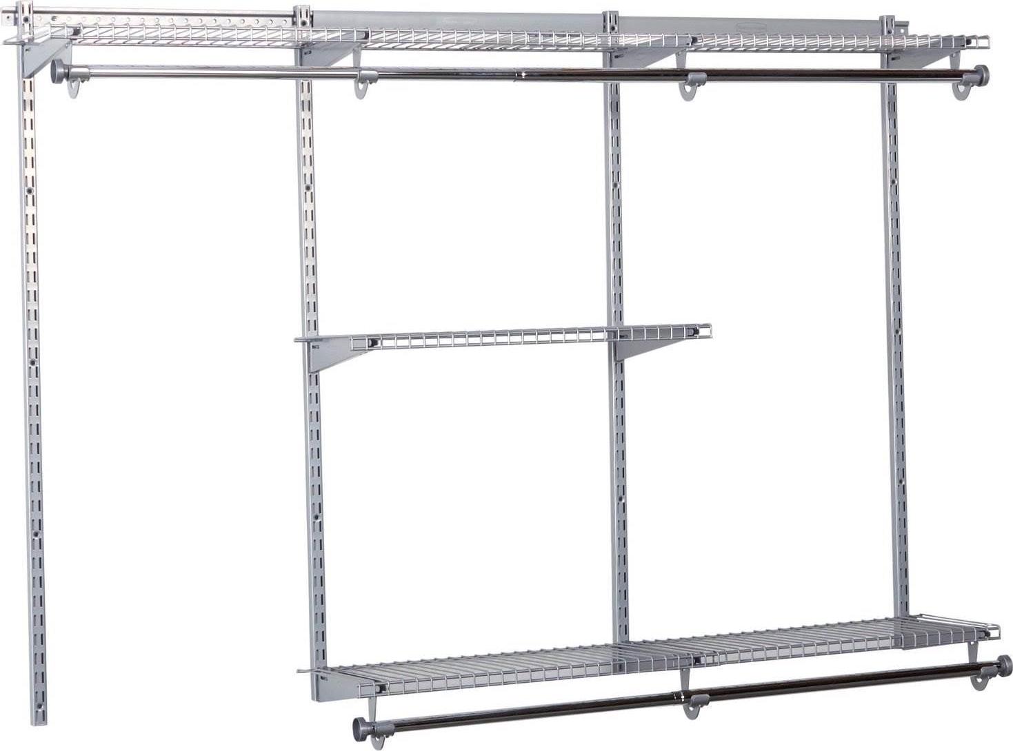The Rubbermaid 3-6ft Expandable Closet Kit fits in any walk-in or reach-in closet that is between three to six feet wide and at least fourteen inches deep. This modular closet kit comes with all the hardware needed for installation and can be assembled in a variety of configurations to meet storage needs and design preferences. Telescoping hang rods are included to enable hangers to glide freely along the system. Rearrange the shelving and hang rods at any time as storage needs change without any tools, simply unlock the shelves, remove the shelves and brackets, and reposition them to the desired design.