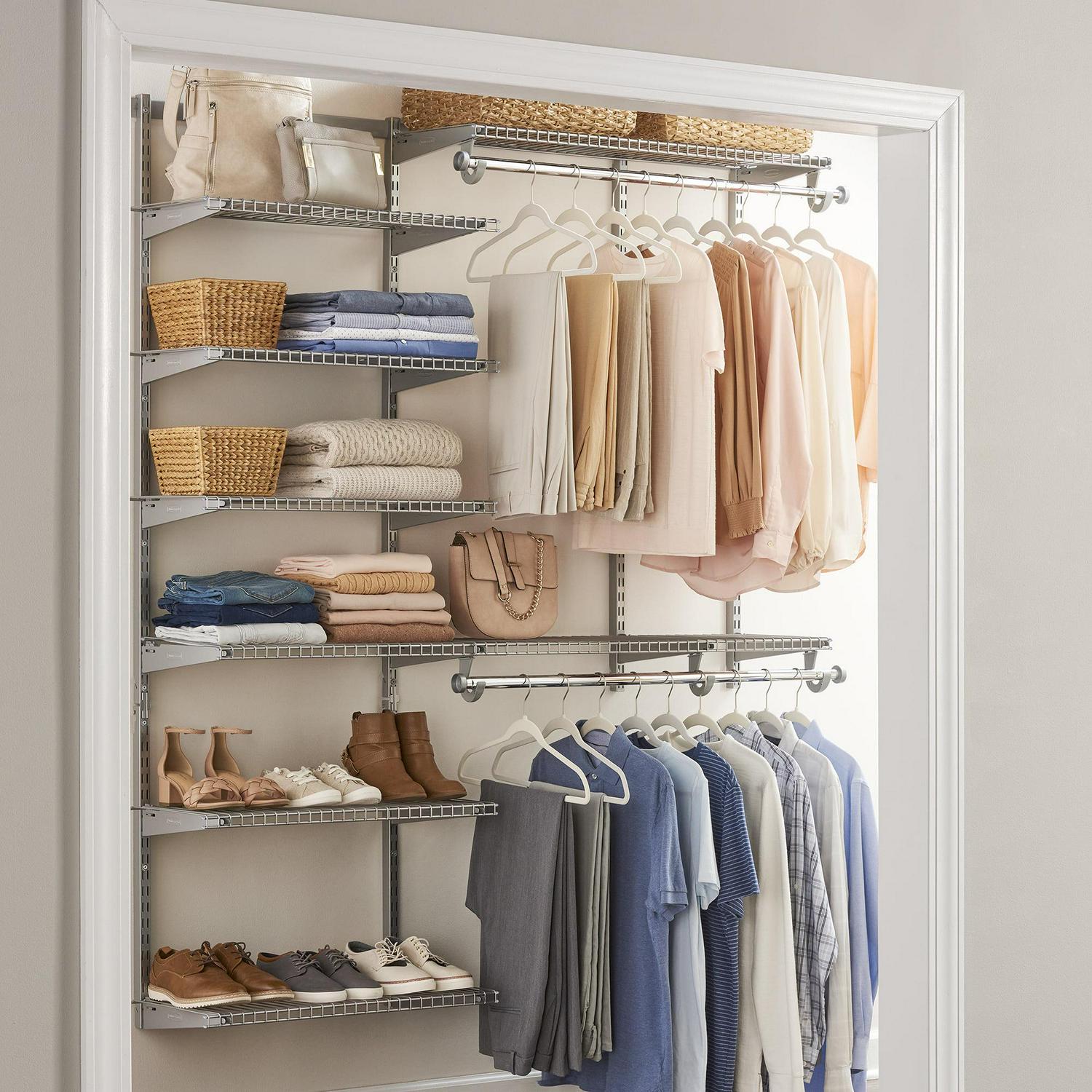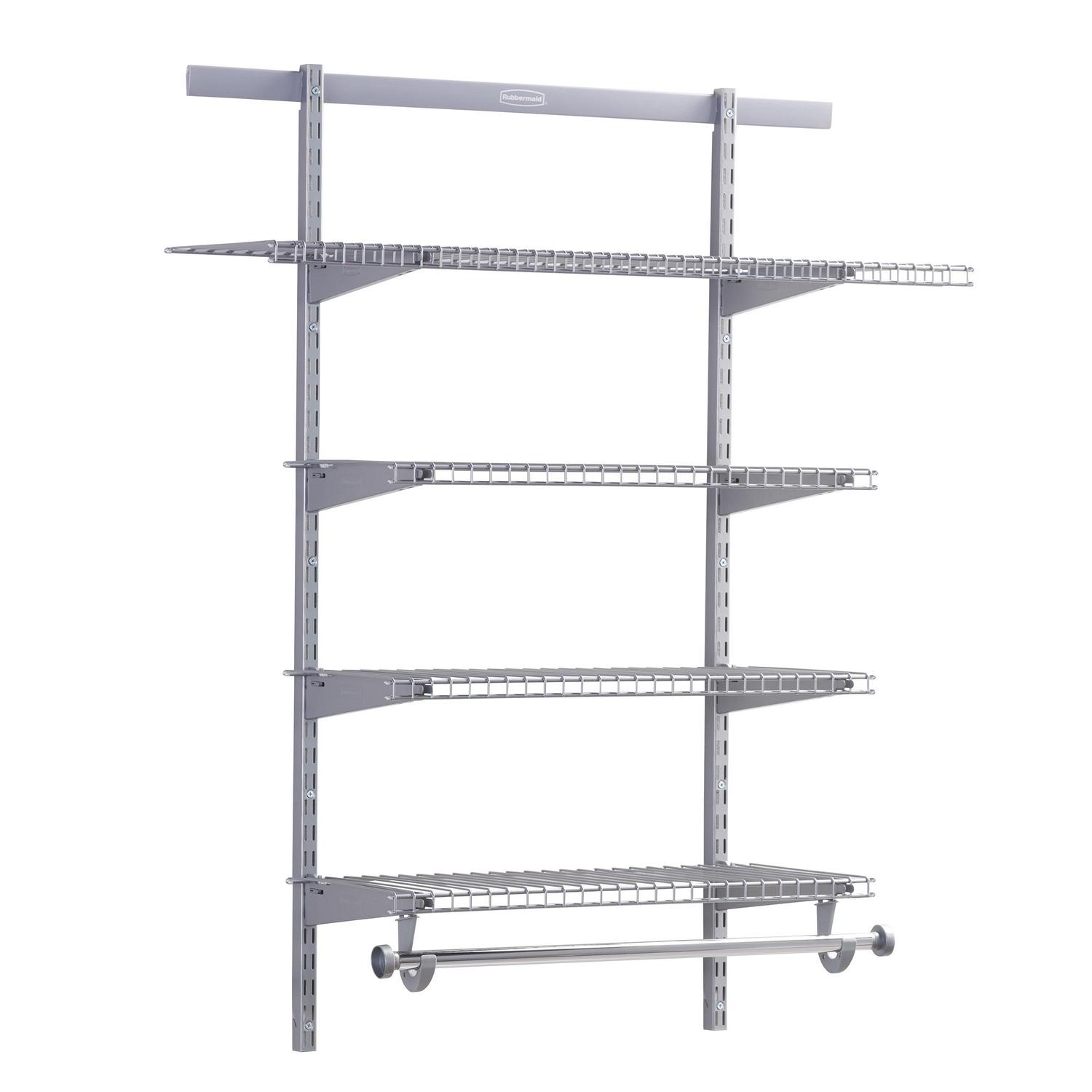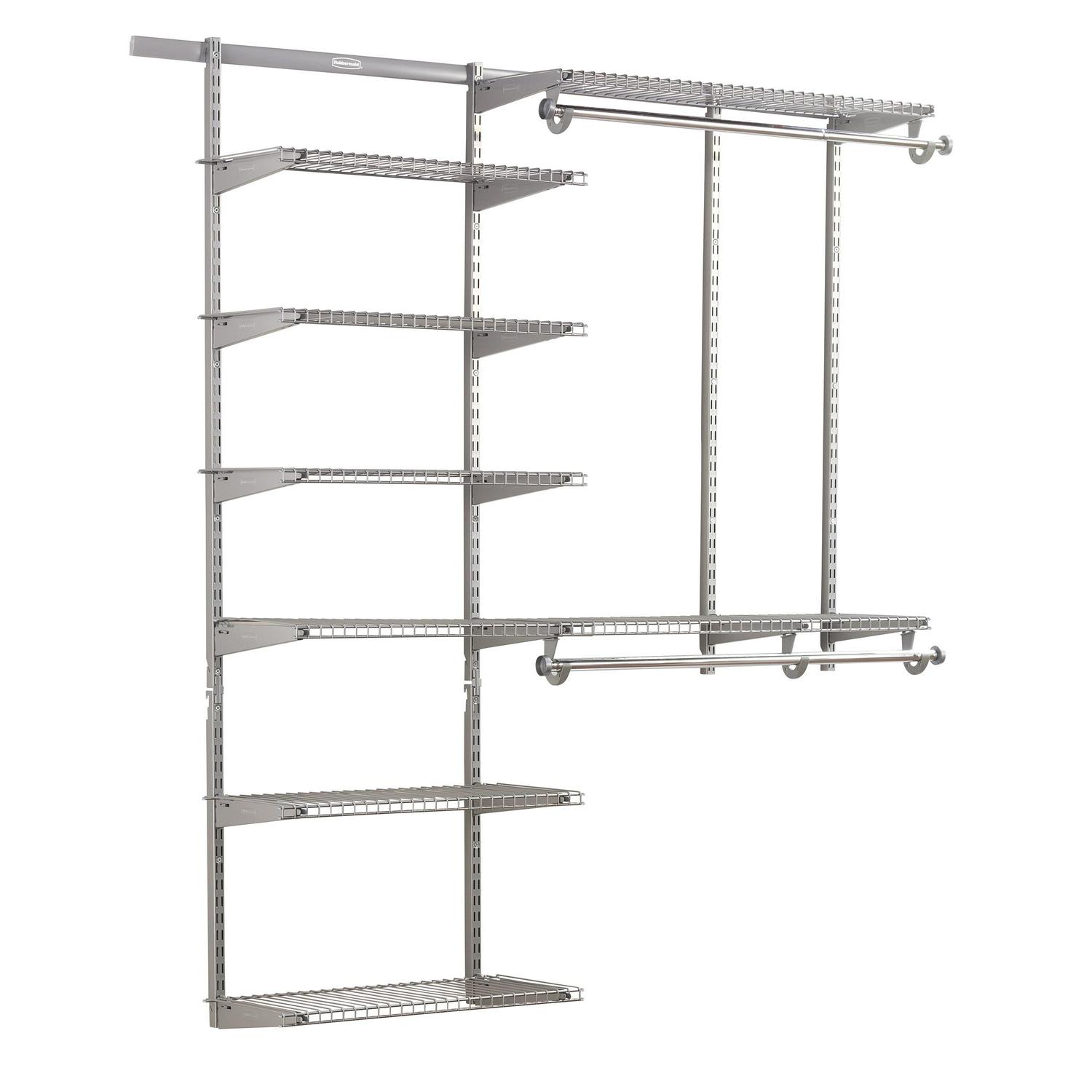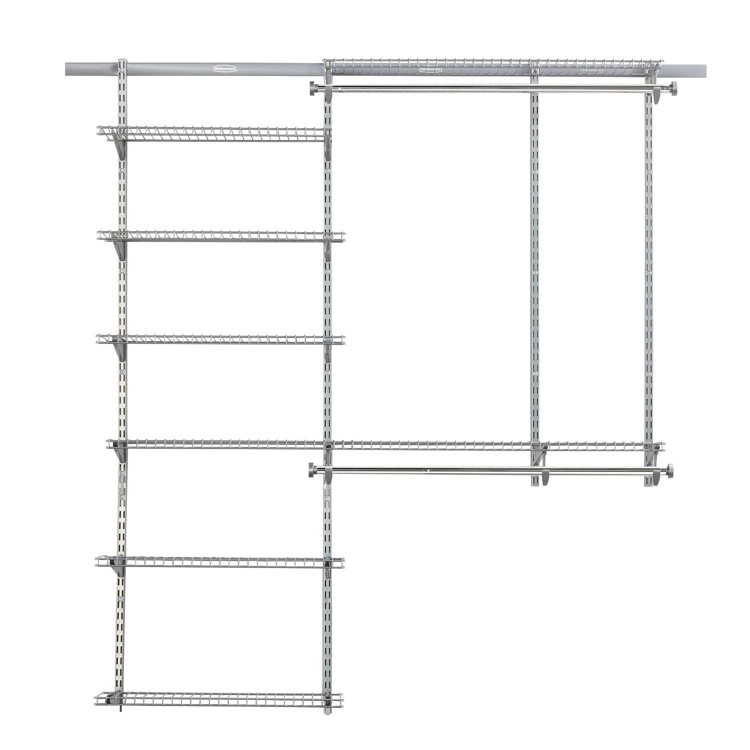 The Rubbermaid 3-6ft Expandable Deluxe Closet Kit fits in any walk-in or reach-in closet that is between three to six feet wide and at least fourteen inches deep. This modular closet kit comes with all the hardware needed for installation and can be assembled in a variety of configurations to meet storage needs and design preferences. Telescoping hang rods are included to enable hangers to glide freely along the system. Rearrange the shelving and hang rods at any time as storage needs change without any tools, simply unlock the shelves, remove the shelves and brackets, and reposition them to the desired design.