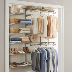 – Expandable shelving and overlapping rails allows for easy, no cut closet installation