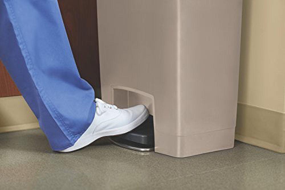 Designed to satisfy the diverse needs of any facility. Maximizes space efficiency with a small footprint and slim profile. Fits in even the tightest spaces. Internal hinge design prevents wall damage. Quiet and controlled lid-closure minimizes noise. Liner retainer band and cinch easily and securely holds can liners. Increased foot pedal clearance for easier access and operation. Front Step Style Foot pedal located on the wide side of the container. Waste Receptacle Type: Indoor All-Purpose Waste Bin; Material(s): Polyethylene; Application: Indoor All-Purpose Waste Disposal; Capacity (Volume): 18 gal.