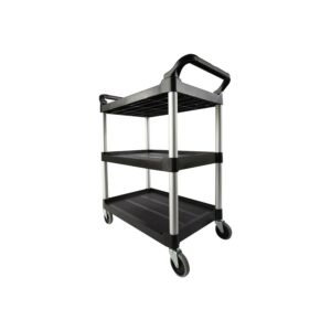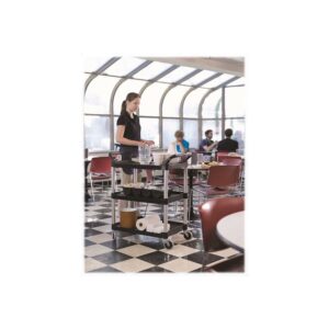 Versatile; for audio/video, filing, food service. Shelves feature 1/4″ lip on three sides and one flat side for easy loading. Brushed aluminum uprights, dual molded handles. Color: Black; Color Family: Black; Capacity (Weight): 200 lbs; Caster/Glide/Wheel: Four 4″ Non-Marking Swivel Casters. Warranty: Manufacturer’s limited one-year warranty. Post-Consumer Recycled Content Percent: 0%. Pre-Consumer Recycled Content Percent: 0%.