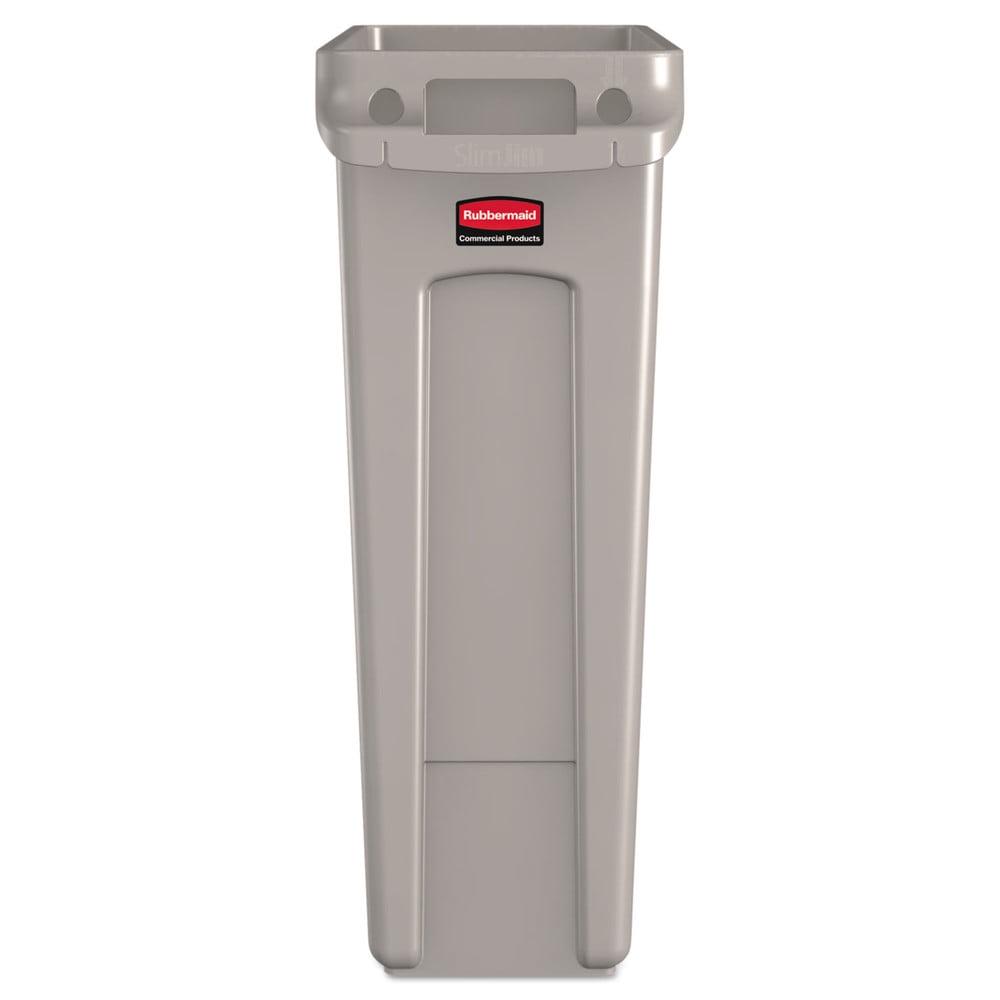 Rubbermaid Slim Jim waste receptacle with venting channels makes light work of taking out the trash. A functional design holds trash can liners in place until you are ready to remove them. Made in a sleek and narrow size, this trash receptacle slides into spaces where others cannot, yet it can also hold 23 gallons of waste to cut down on how often you need to dump out the trash. When the container is full, the innovative venting channels minimize the amount of energy required to empty it.