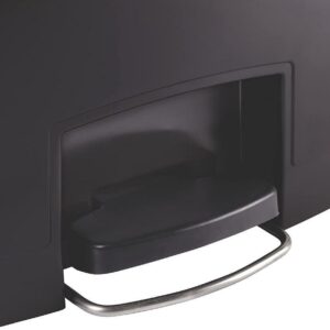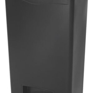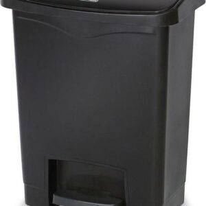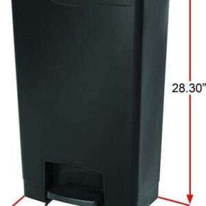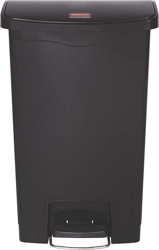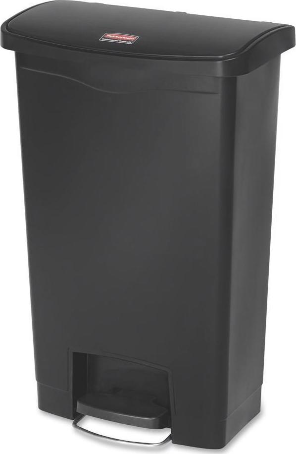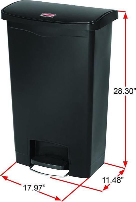 Rubbermaid Commercial Slim Jim Black 13G Front Step Can – 13 gal Capacity – 28.3″ Height x 11.5″ Width – Resin, Plastic, Poly – Black Resin step-on container is perfect for hands-free garbage disposal indoors and holds up to 13 gallons. Increased foot pedal clearance provides easier access and operation. Pedal is located in the front. Slim profile and small footprint maximize space to fit in tight spaces. Internal hinge design prevents wall damage. Quiet, controlled lid closure minimizes noise to enhance guest and patient satisfaction. Liner retainer band easily and securely holds polyliners.