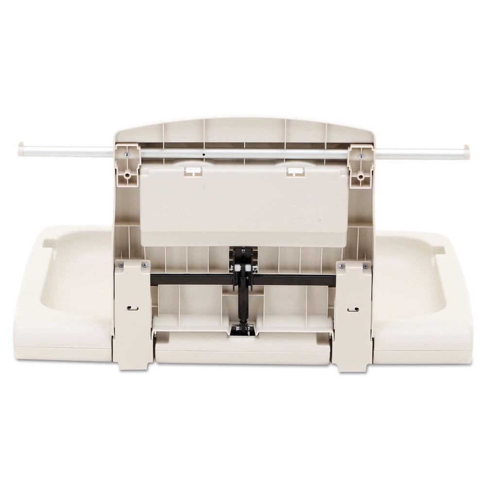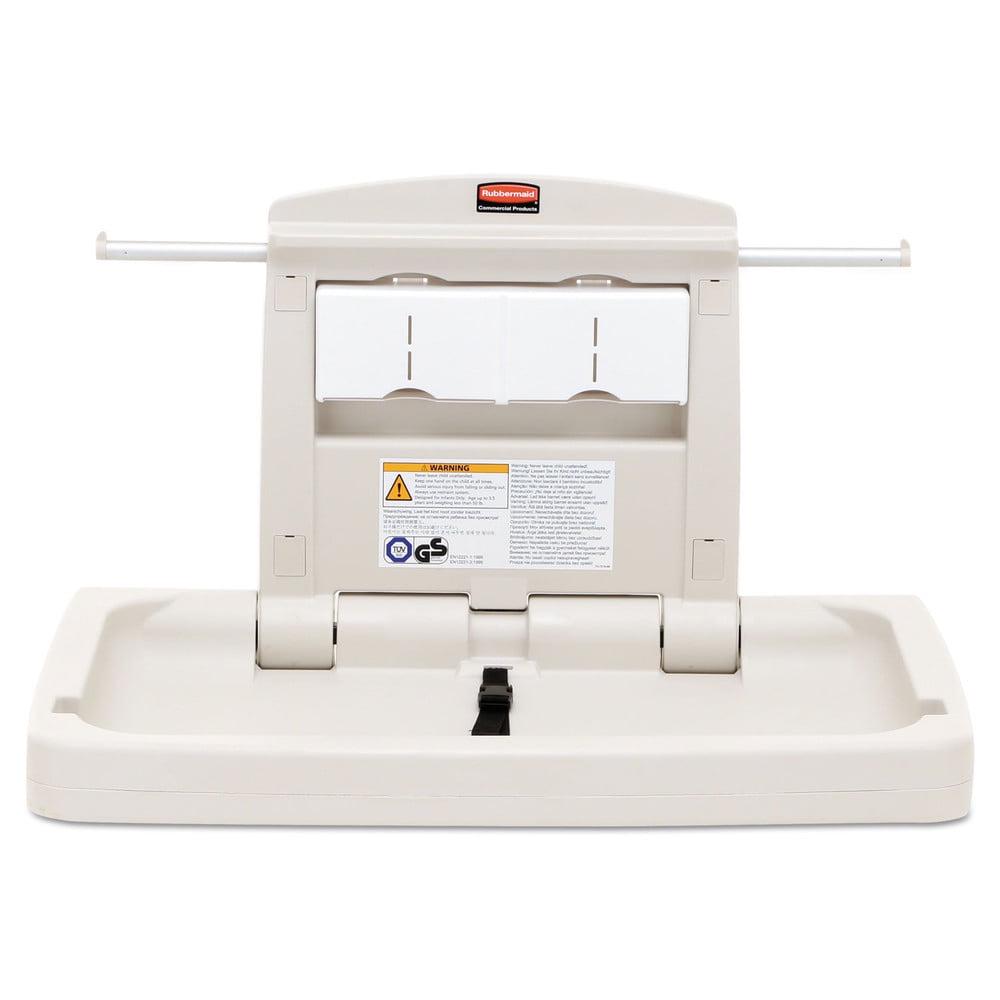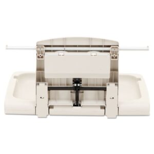 The Rubbermaid Horizontal Baby Changing Station is designed for commercial environments. Built from high-density polypropylene, this baby changing pad table does not absorb moisture. This baby station meets all global EN, FDA, ADA, and ASTM safety standards. The sturdy station features an accessory shelf to keep items away from baby plus easy reach hooks. The smooth surface makes this changing table easy to clean. Size (W x L): 33 1/2″ x 21 1/2″; Material(s): Plastic; Color(s): Platinum; Folded Depth: 4″.