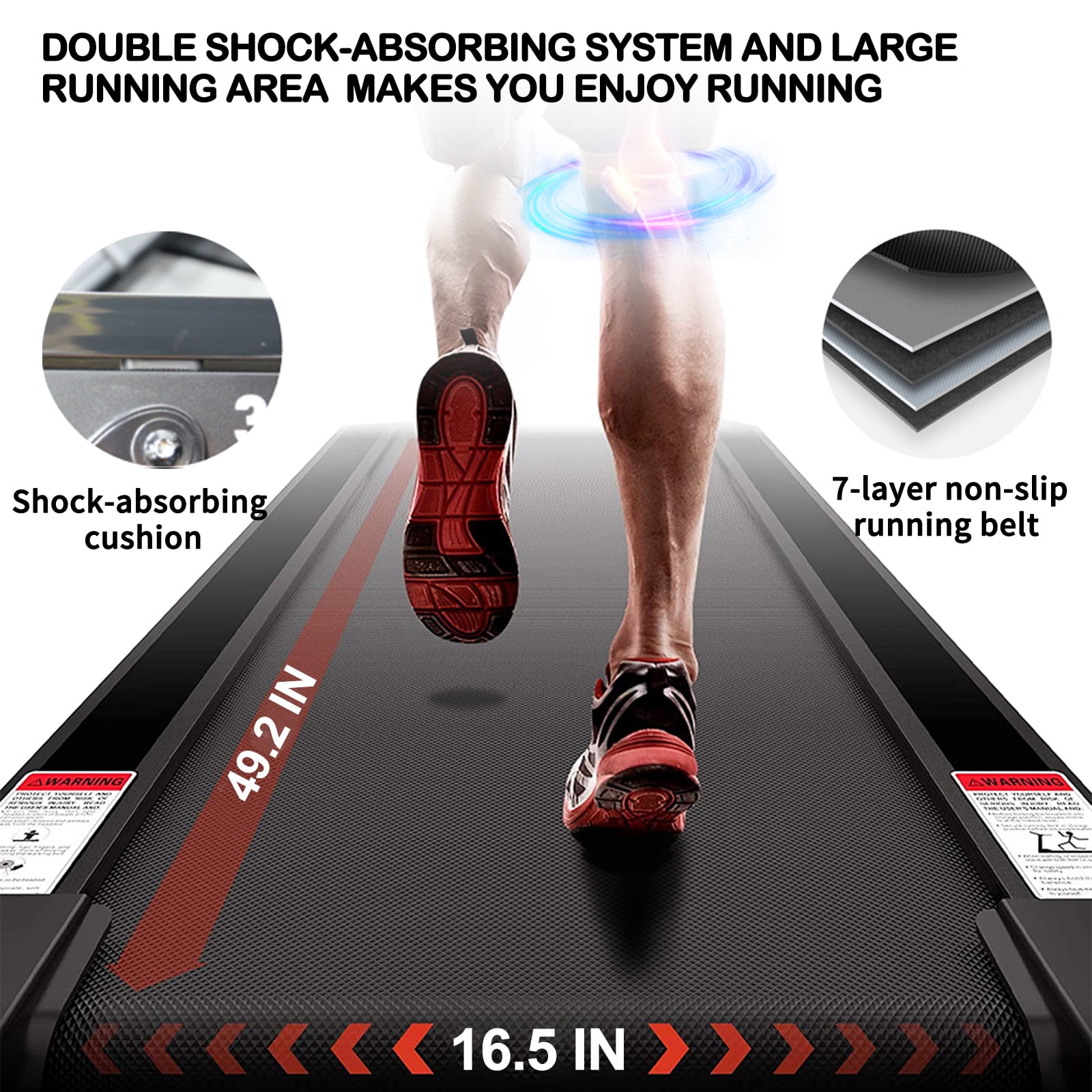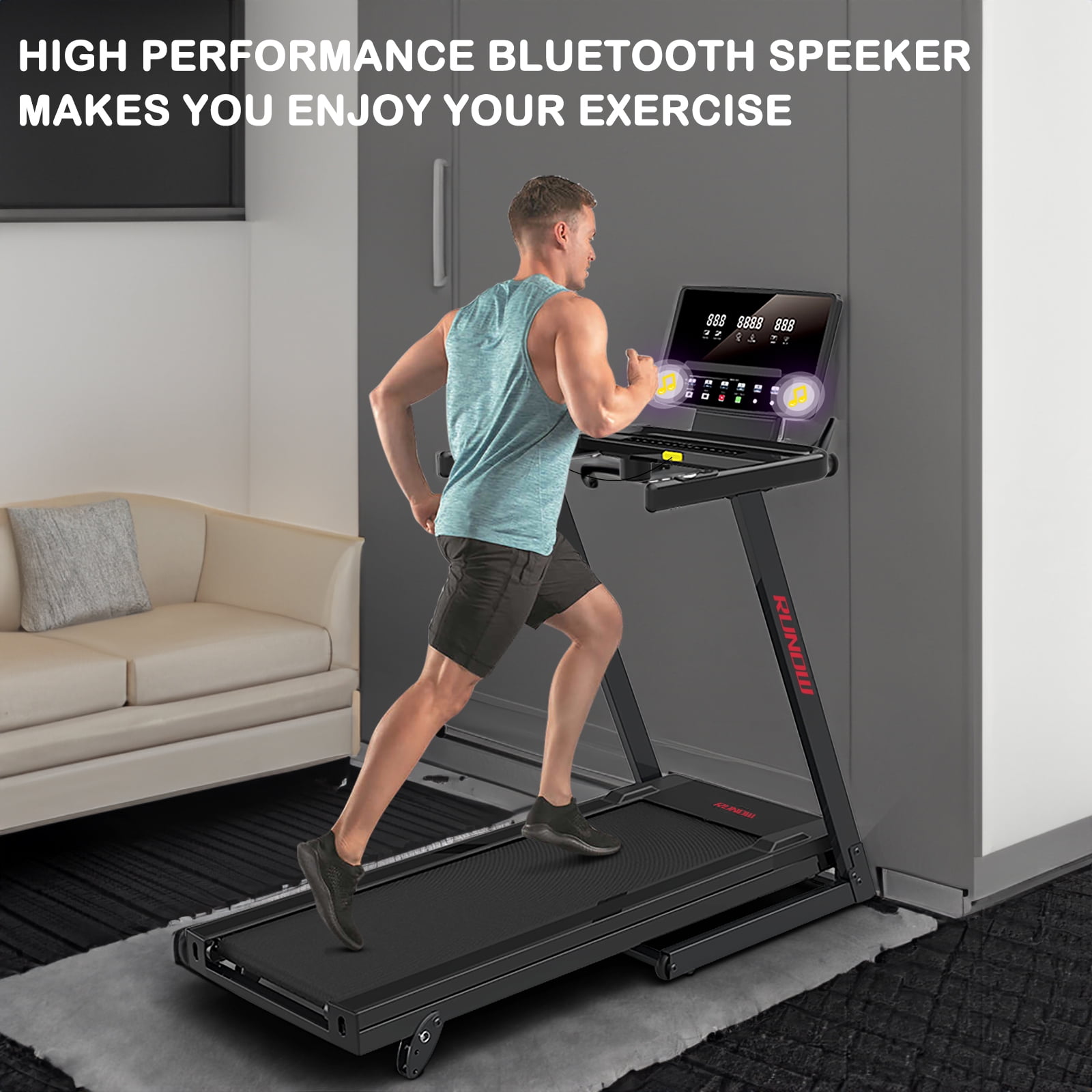 RUNOW 2.5HP Electric Exercise Treadmills Support 0.6-8.1MPH, 300LBS Capacity Folding Treadmill with 40 Programs, 18IN LED Monitor, Bluetooth Speaker and 3-levle Manual Incline, Treadmills with 49.2 X 16.5IN Large Running Belt for Home & Office Description: RUNOW treadmill has a 2.5 HP powerful and quiet motor designed specifically for home and office use. Its maximum speed can reach 8.1 Miles per hour. The treadmill for home can be folded up for small-footprint storage, and it folds up quickly and safely without any tools. With hydraulic rod mechanism, only one gentle kick, the treadmill would lower to the ground slowly and safely. Top quality 16.5 inch wide grass patterned belt provides optimum tread while offering enough space to walk, jog and run comfortably. Feature: 2.5HP POWERFUL & QUIET MOTOR supports speed adjustment from 0.6-8.1MPH. 7-LAYER ELASTIC CUSHIONING BELT and Built-in SHOCK-ABSORBING SYSTEM protect your joint. 40 CUSTOMIZED PROGRAMS to meet various fitness goals. Built-in BLUETOOTH SPEAKER for an enjoyable workout experience. 3-LEVEL MANUAL INCLINE adjustment for added intensity. 18IN LED DISPLAY tracks your exercise data at any time. TWO TRANSPORT WHEELS and FOLDABLE DESIGN for easy storage. Specification: Material: Alloy Steel, Plastic Unfold Size: 60.4 * 26.6 * 55.9in (L x W x H) Folded Size: 37.6 * 26.6 * 55.9in (L x W x H) Running Area: 16.5″*49.2″ Net Weight: 110 lbs Weigh Capacity: 300 lbs Speed: 0.6-8.1MPH Incline Levels: 0-5% Speaker: 2 Maximum Horsepower: 2.5 Horsepower Screen Size: 18 Inches Display Type: LCD Deck Length: 49.2 Inches Deck Width: 16.5 Inches Power Source: Electric Package List:RUNOW Treadmill, User Manual, Safety Key, Power Cord, Tool Kit, Lubricant