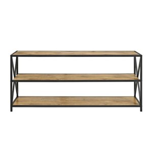 Showcase your books, magazines, media, and more with this beautiful Rustic Barnwood and Metal 3-Shelf Bookshelf by Manor Park. Durably constructed of high-grade MDF and powder-coated metal, together create a sturdy, yet stylish shelving unit. The combination of metal and wood x-shaped sides give a rustic aesthetic, perfect for your entryway, bedroom, or living room. This bookshelf can make an industrial style statement, while also providing you with space to store your things. Decorate with your book collection, plants, and artistic elements to match your living space.