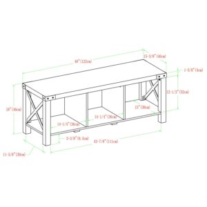 Usher in this storage-friendly farmhouse bench into any number of places in your home with the Rustic Farmhouse Metal X Entryway Storage Bench. It’s a great addition in the entryway, at the foot of a bed, or in your living room because it provides extra seating and accommodates space-saving needs. The three cubbies fit most standard-size bins. The charm of this bench continues with its metal accents. With riveted angle details on the top corners and black metal x’s on the sides, you’ll get a rustic feel that transforms this bench into so much more than mere wood and metal.The collection blends rustic farmhouse style with bohemian accents perfect for any season. This collection makes it easy and affordable to brighten up any room with cozy, vibrant, quality pieces.