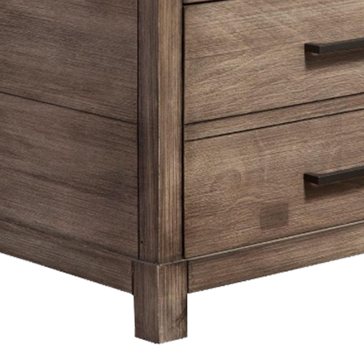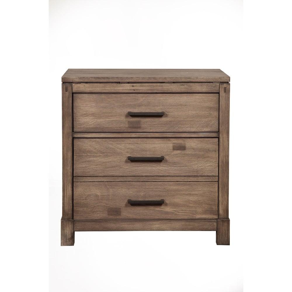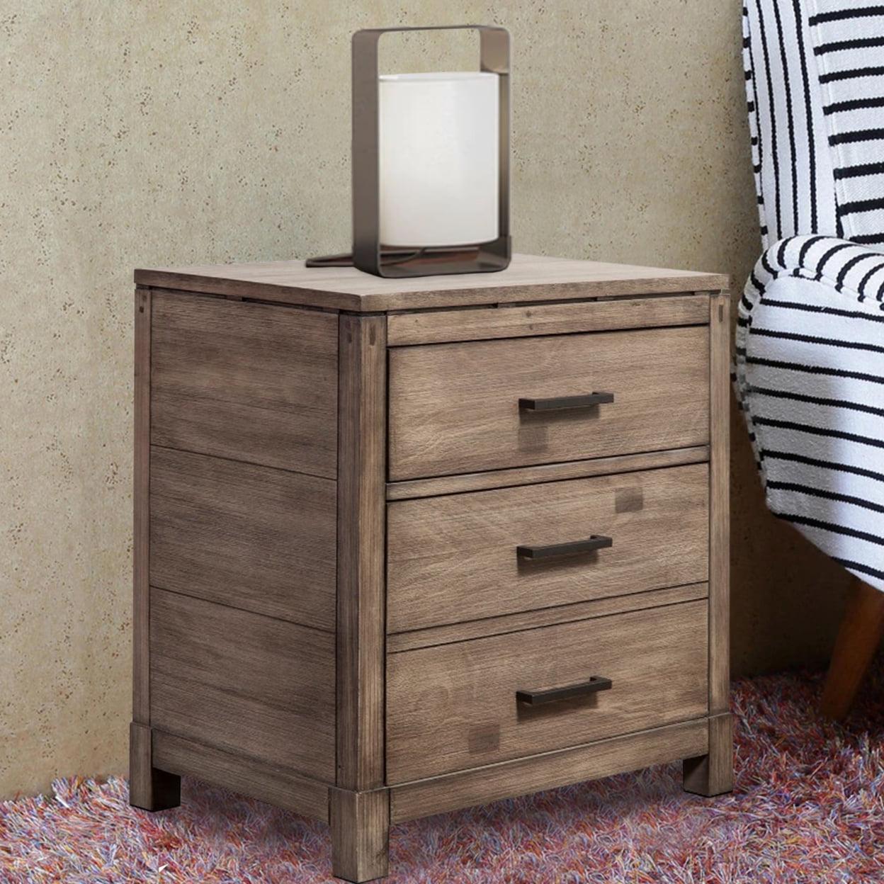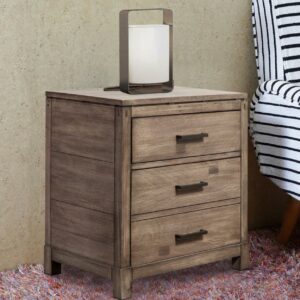 Rustically Designed Nightstand with 3 Drawers Brown- Saltoro Sherpi Decorate your bedroom with this attractive Drawer Nightstand. Made from solid mahogany and andamp; Okoume Veneer. This handsome piece fits with any decor. This three drawer nightstand features ball bearing metal drawer glides. The Weathered Gray ( Brown) finish provides a unique and appealing look that can be enjoyed for years to come.