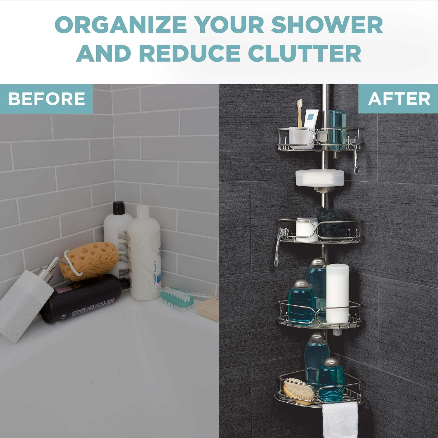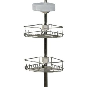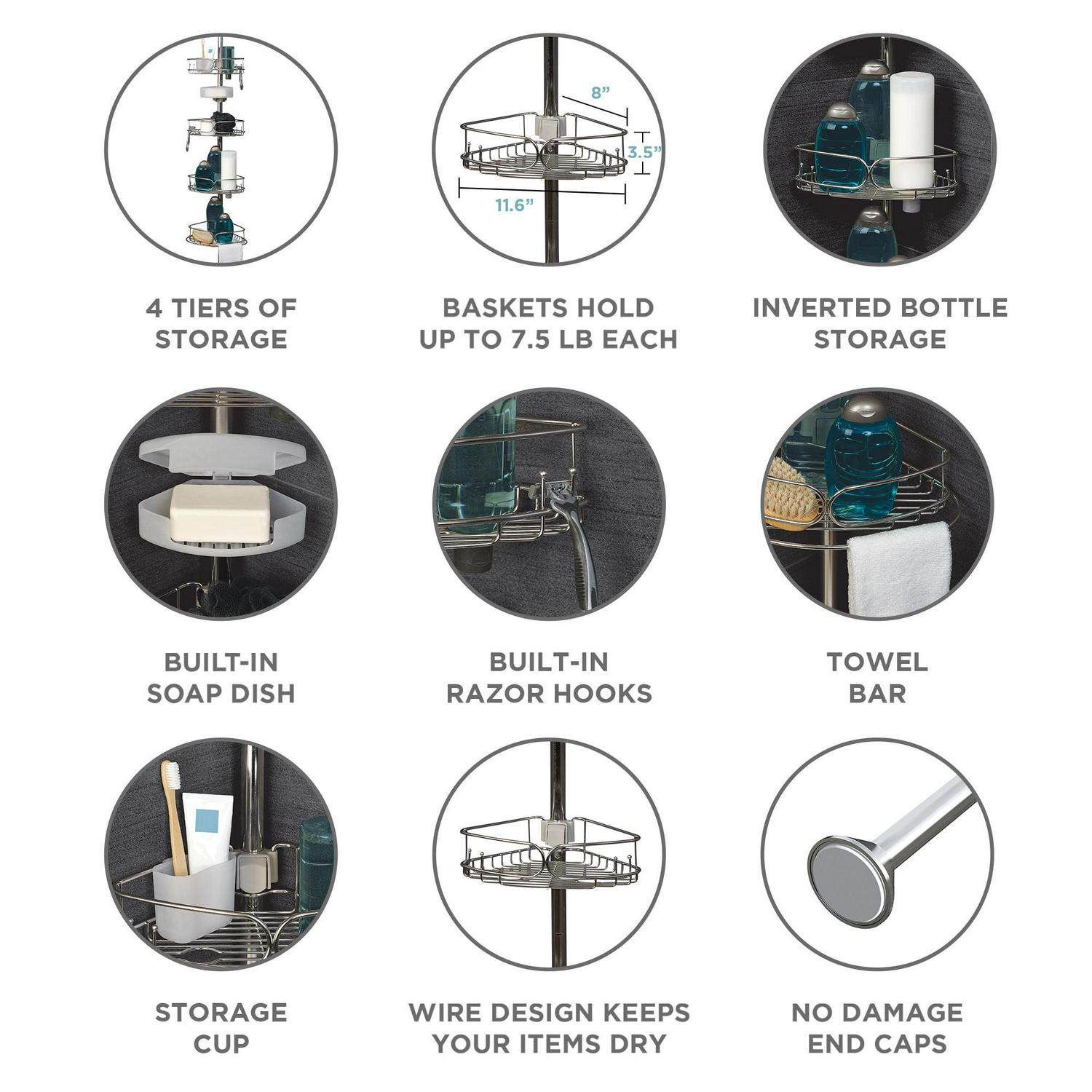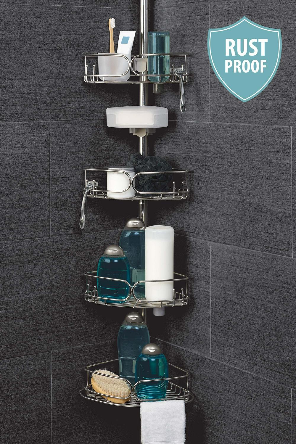 The Zenna Home Rustproof Tension Pole Shower Caddy boosts your bathroom organization with four tiers of easy-to-access shelving. This handy shower pole caddy is made of durable, high-grade stainless steel that is guaranteed rustproof. Its four basket shelves adjust up and down the pole and can be removed to fit your storage needs. Each shelf locks in place with a lever bracket. In addition to storing shower items, the quick-draining storage shelves feature inverted bottle storage, hooks for razors and washcloths, a built-in towel bar and a storage cup. The caddy’s tension mechanism makes it easy to install in standard-height bath and shower spaces from 5 to 9 feet tall. Large, rotating rubber end caps provide enhanced stability.