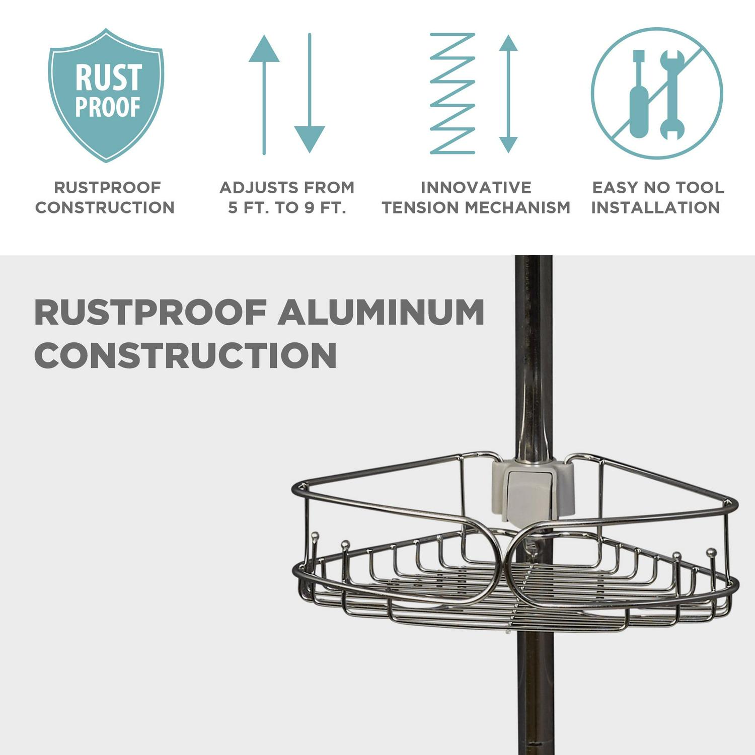 - Shower pole caddy’s high-grade stainless steel construction is guaranteed rustproof