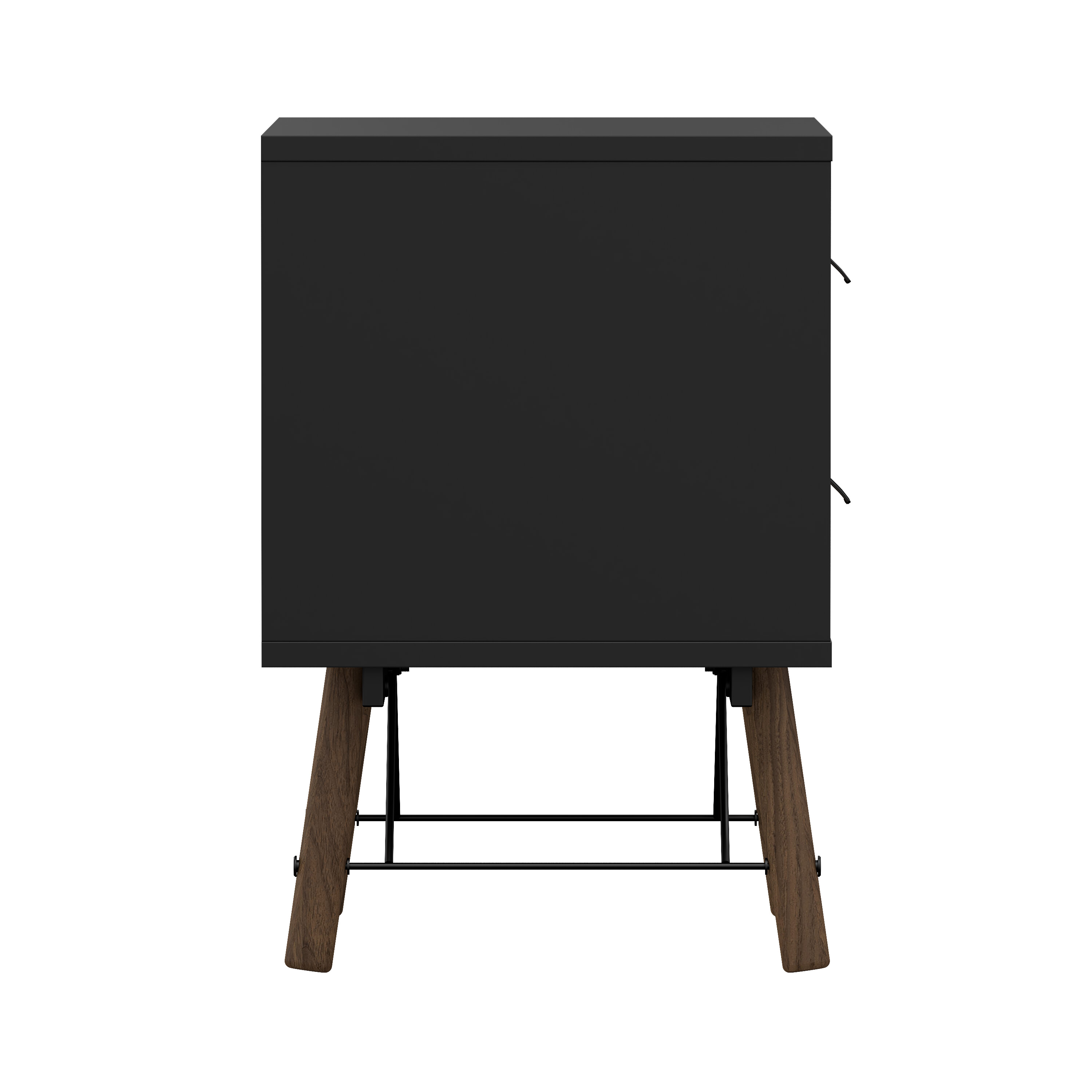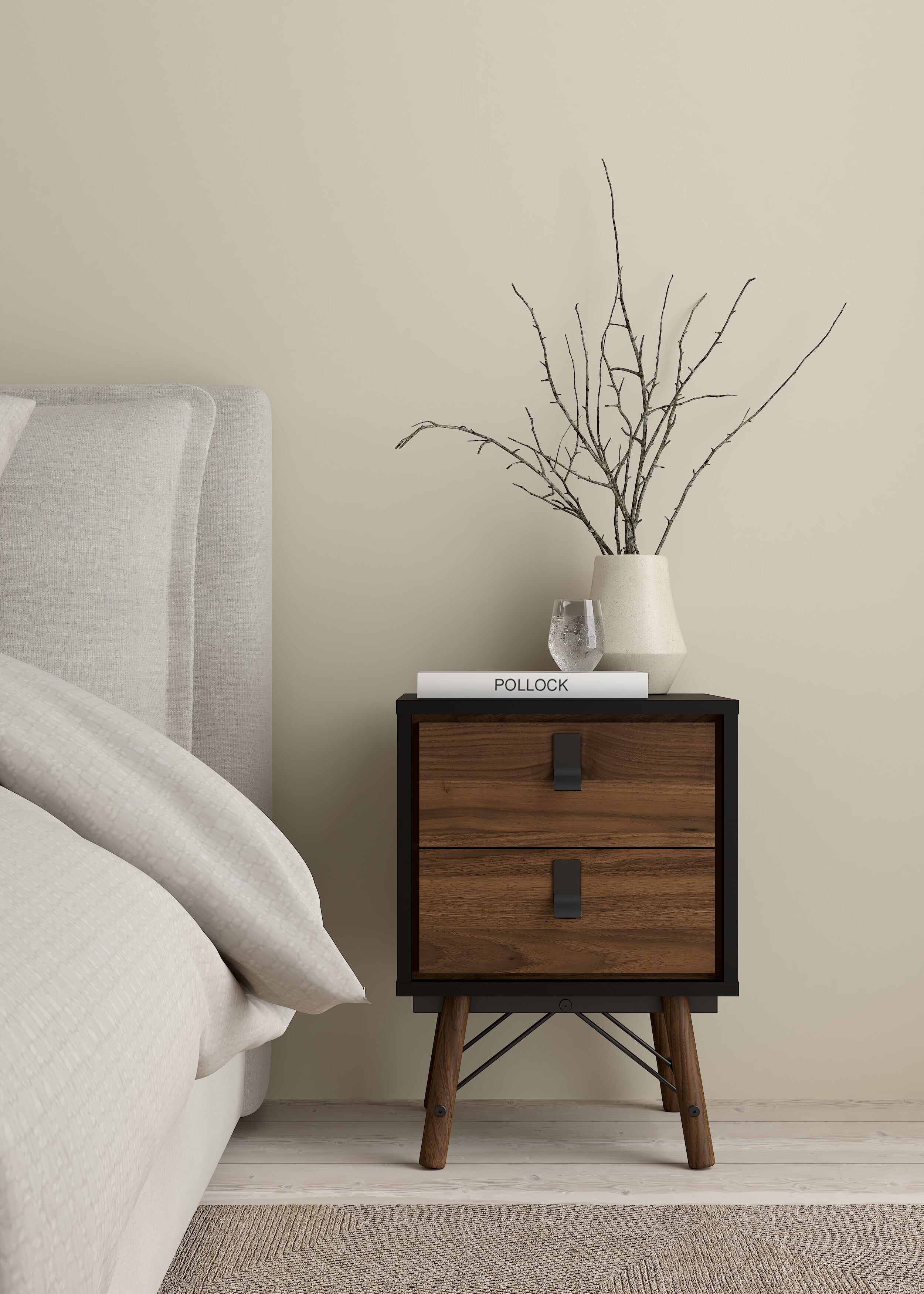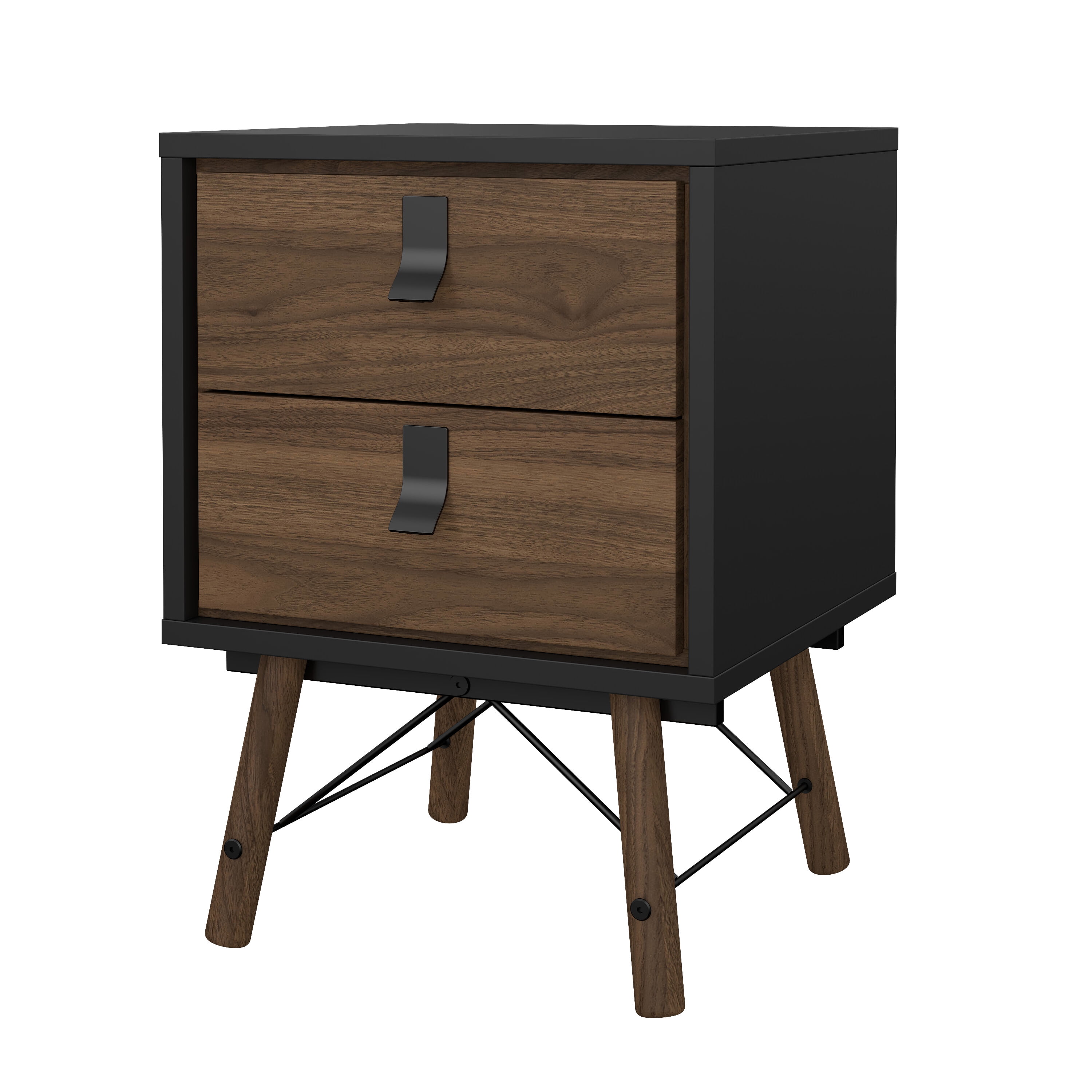Create a calming atmosphere with the Ry 2 Drawer Nightstand. Inspired by the tranquility of Ry, a small Danish city – Black illustrates the rich soil and the dark wooden finish incorporates the warm, natural feeling from the forests. The nightstand offers two drawers for concealed storage while the black metal handles allows for easy opening and closing. The two tone inner frame and angled solid wood legs connected by black metal bars mimics the sunlight shining through the leaves on a forest walk. The Ry collection is Danish designed with the calming, crisp air of Ry never far from mind and made in easy-to-clean foil surface. Pair this nightstand with other items from the Ry collection to create a tranquil bedroom