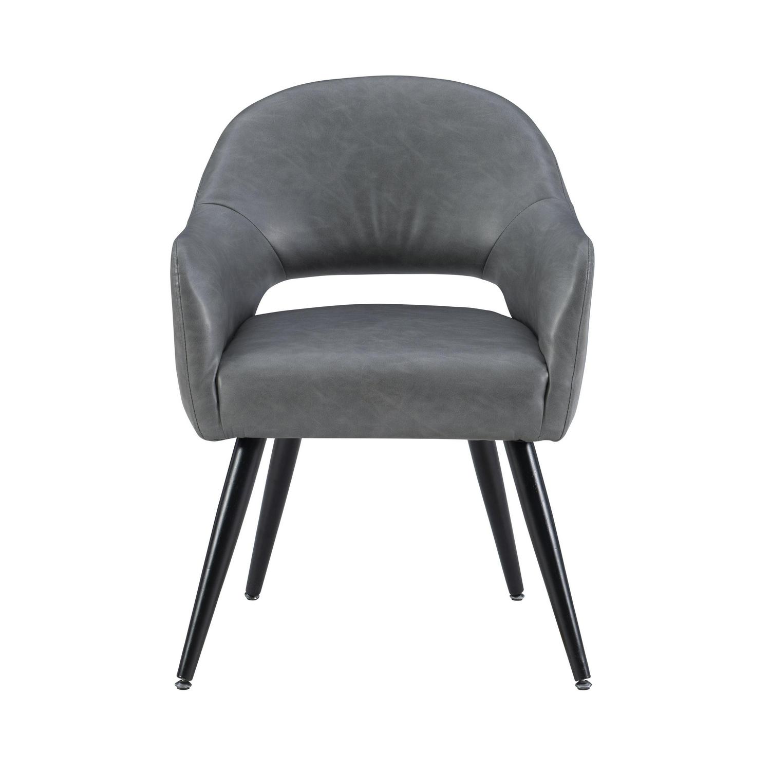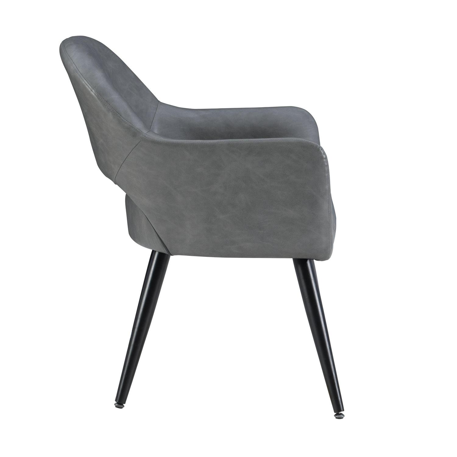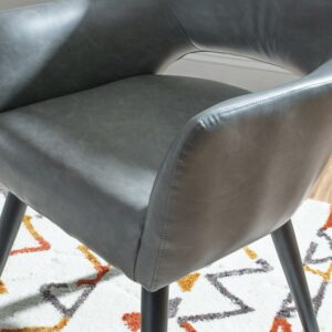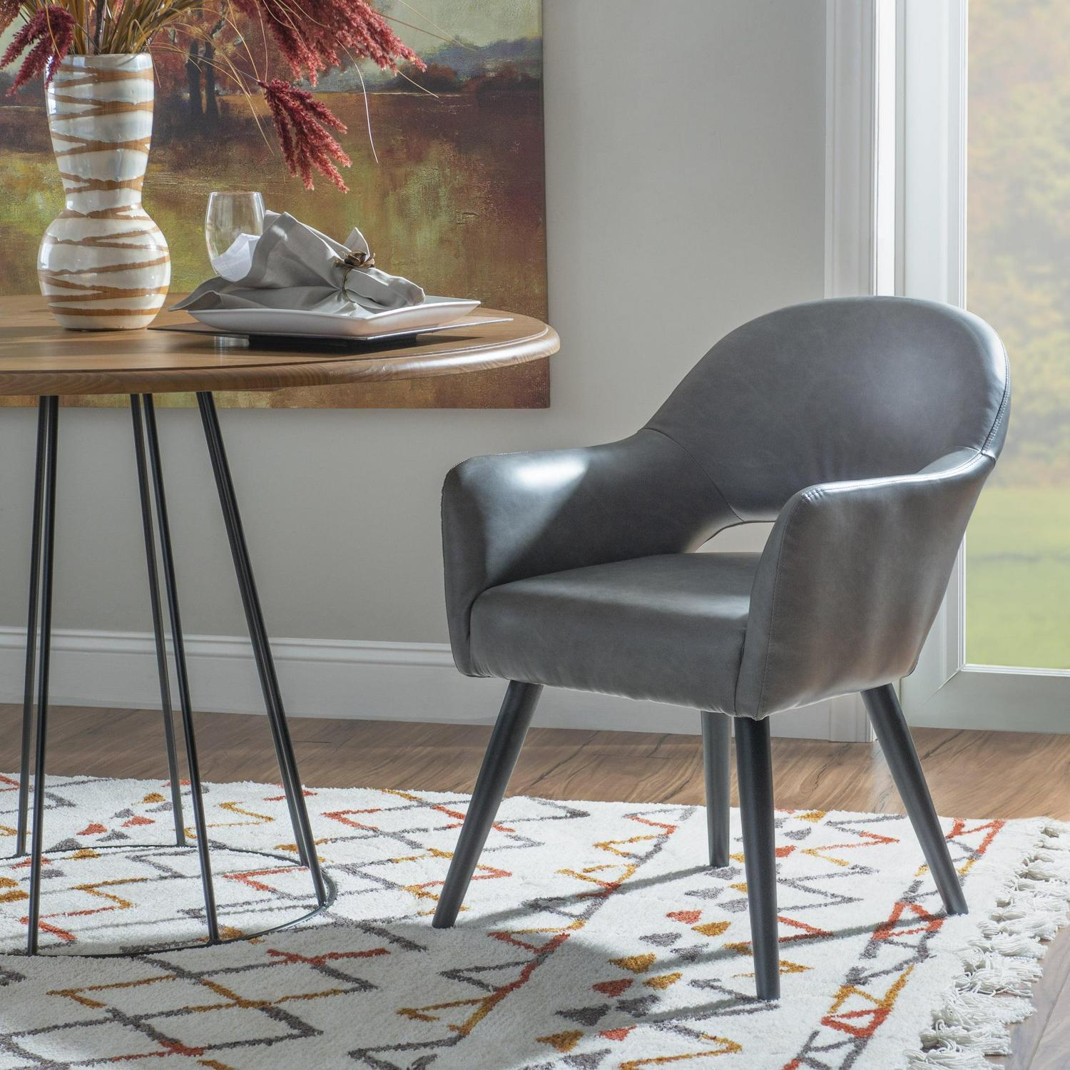 For those seeking the perfect ratio of comfort and midcentury style, the search is over! This elegant Powell Sadler side chair features a slightly curved back and subtle contours in the armrests that create a classic minimalist silhouette. However, generous padding in the sides and plush foam seat offer an accommodating update. Dark gray mottled faux leather upholstery provides an eye catching and easy to clean surface that contrasts with the splayed rubberwood legs in black. Measuring at 23.5 L x 24.75 D x 32.5 H, this piece is great as an accent chair in an office space, or as a dining set when purchased in multiples.