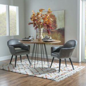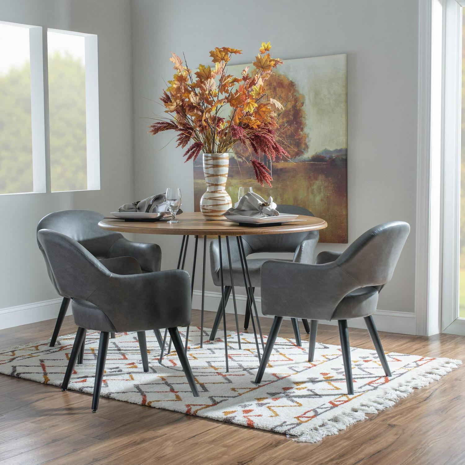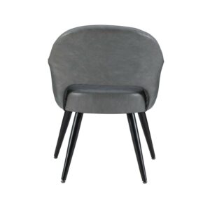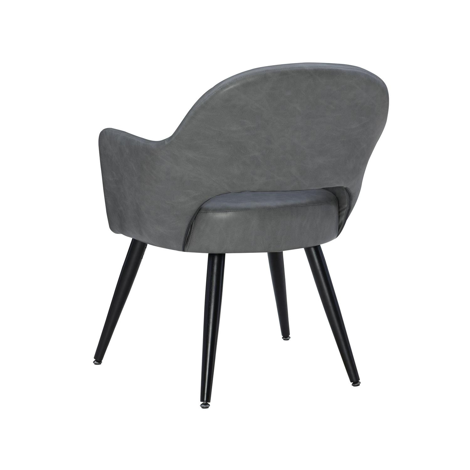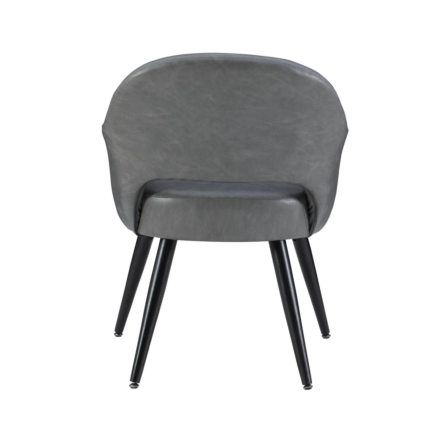 For those seeking the perfect ratio of comfort and midcentury style, the search is over! This elegant Powell Sadler side chair features a slightly curved back and subtle contours in the armrests that create a classic minimalist silhouette. However, generous padding in the sides and plush foam seat offer an accommodating update. Dark gray mottled faux leather upholstery provides an eye catching and easy to clean surface that contrasts with the splayed rubberwood legs in black. Measuring at 23.5 L x 24.75 D x 32.5 H, this piece is great as an accent chair in an office space, or as a dining set when purchased in multiples.