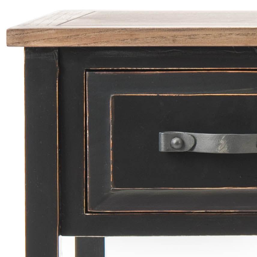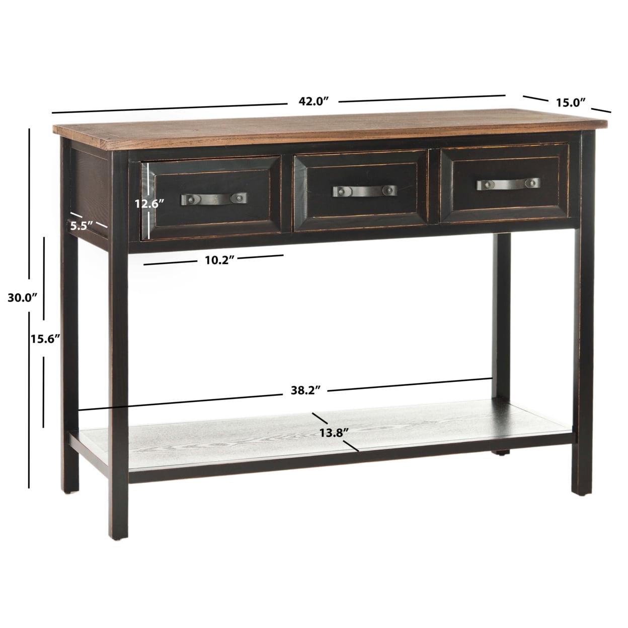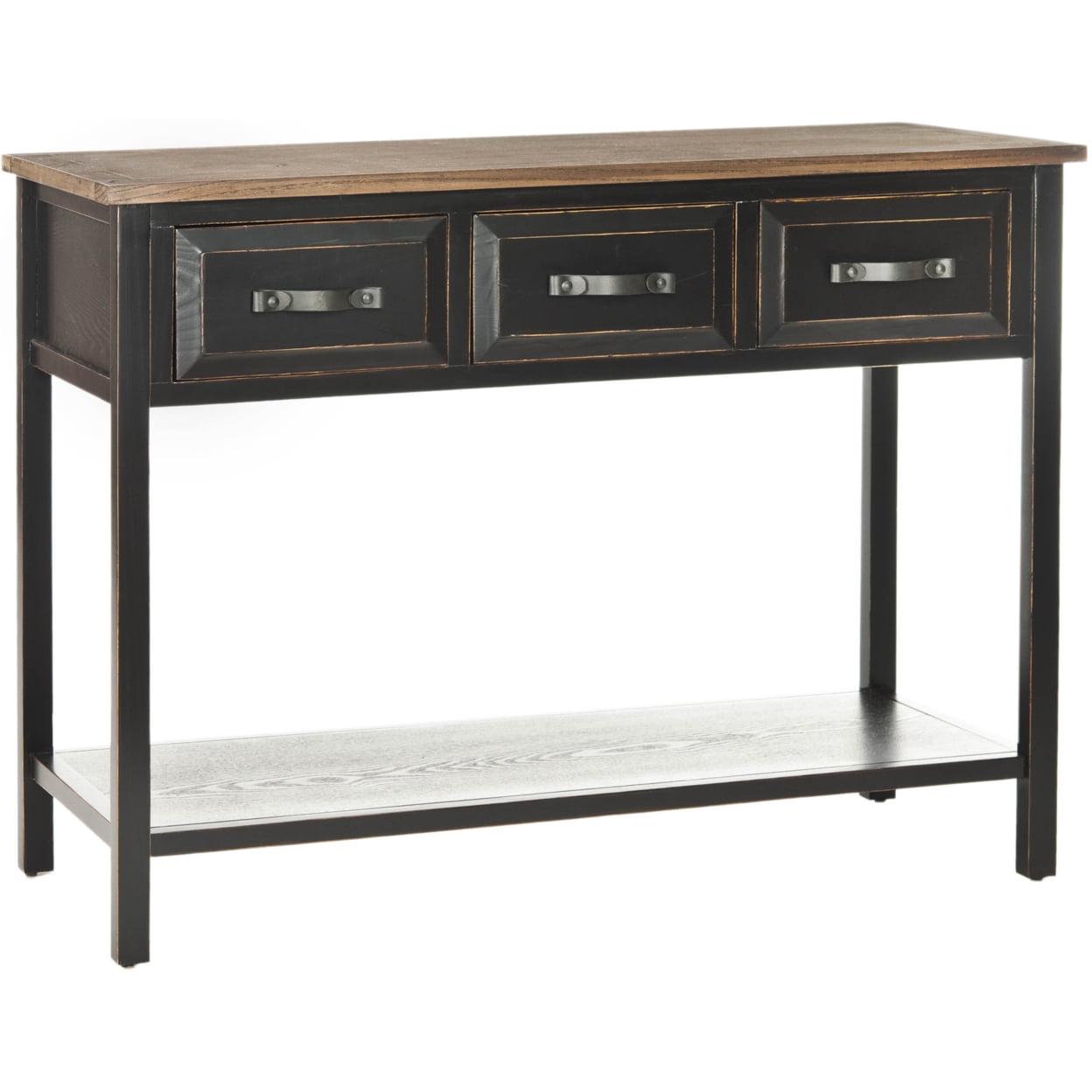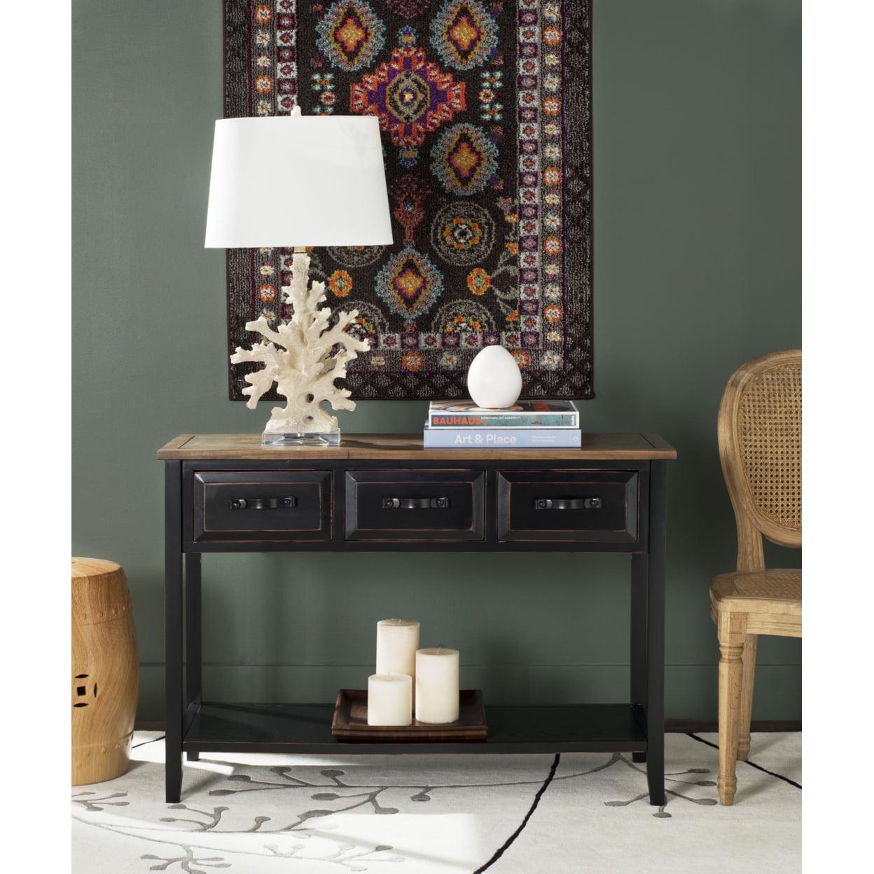 SAFAVIEH Aiden 3-Drawer Console Table Black / Oak Freshen up a hallway or living room wall with the country chic Aiden Console Table . Aiden’s oak finished top beautifully contrasts a distressed black frame, while its traditional styling seamlessly adapts to any style d cor. Three drawers and lower shelf provide ample storage and display.