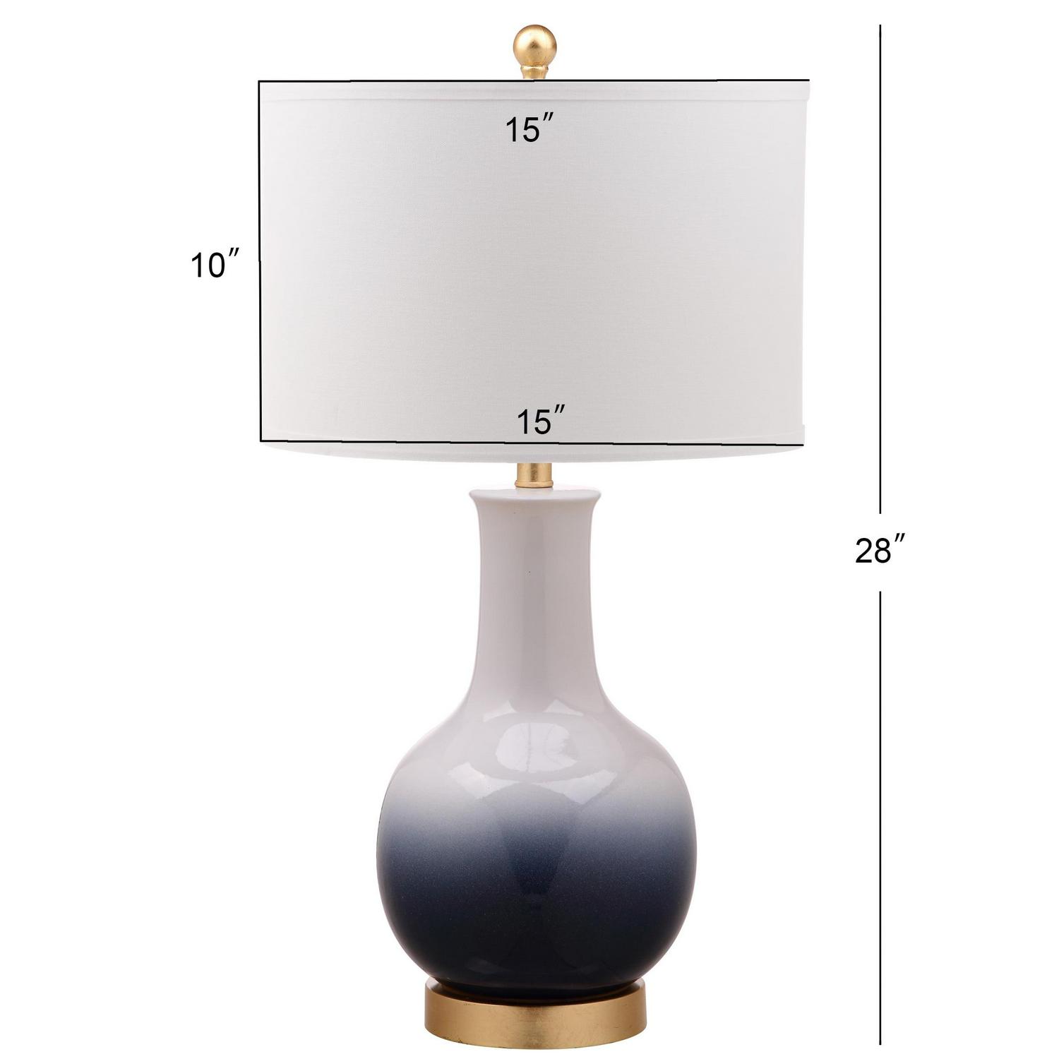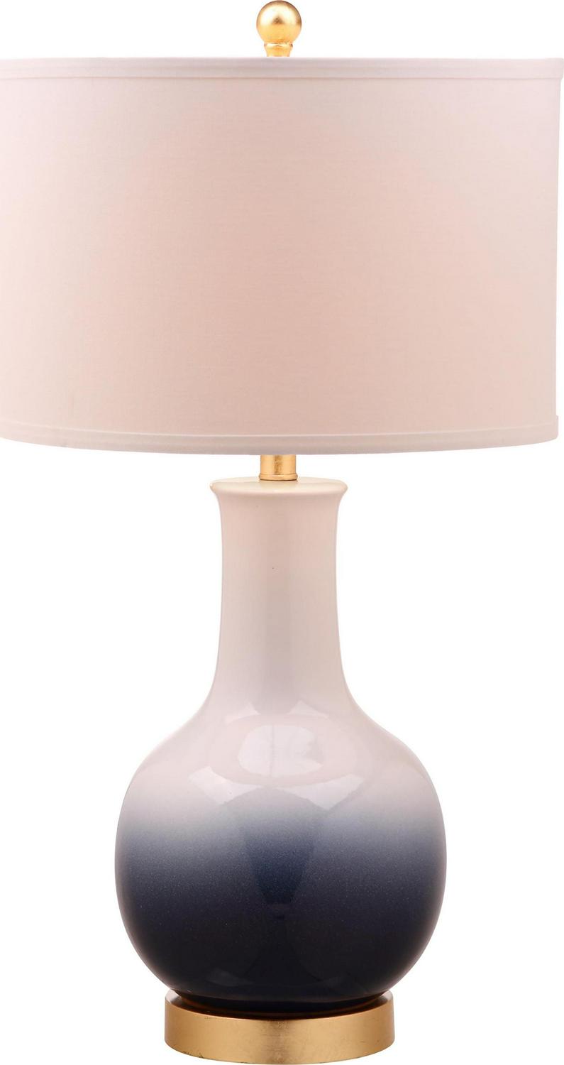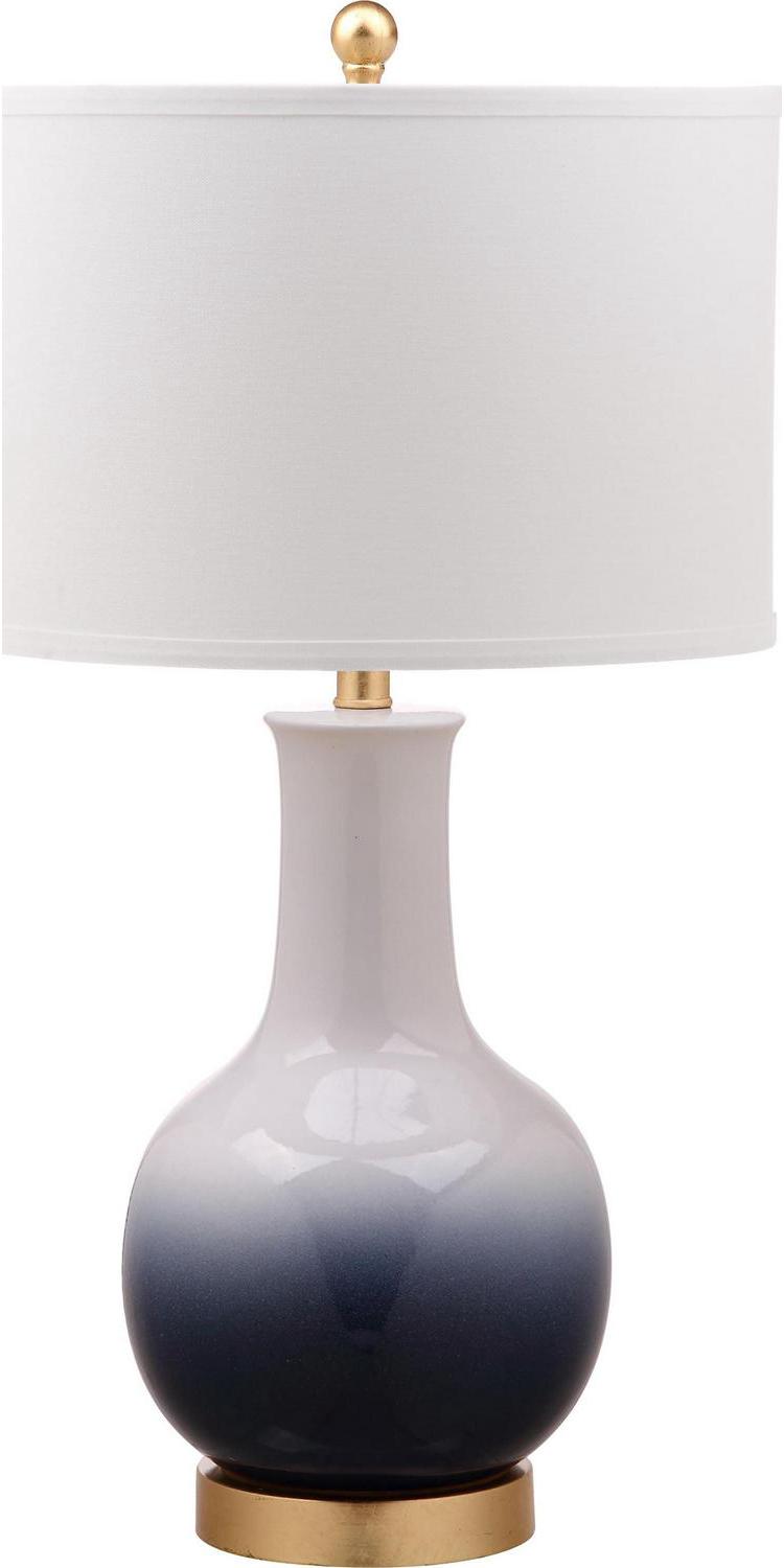 Add modern magic to any living room or bedroom with this contemporary table lamp. Its genie-style ceramic body features smooth curves finished in a chic blue hue. Designers embrace the depth and dimension of its gold metal finish and white linen shade.- Contemporary design adds a chic look to your home